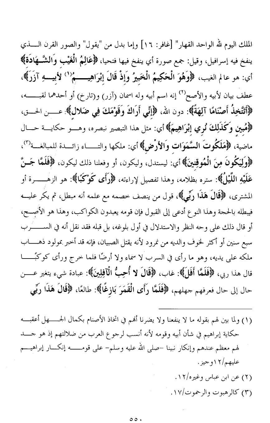 الْمُلْكُ الْيَوْمَ لله الْوَاحِدِ الْقَهَّارِ " [غافر: 16] وإما بدل من " يقول " والصور القرن الذي ينفخ فيه إسرافيل، وقيل: جمع صورة أي ينفخ فيها فتحيا، (عَالِمُ الْغَيْبِ وَالشَّهَادَةِ) أي: هو عالم الغيب، (وَهُوَ الْحَكِيمُ الْخَبِيرُ وَإِذْ قَالَ إِبْرَاهِيمُ لأبِيهِ آزَرَ)، عطف بيان لأبيه والأصح أنه اسم أبيه وله اسمان (آزر) و (تارخ) أو أحدهما لقبه، (أَتَتَّخِذُ أَصْنَامًا آلِهَةً): دون الله، (إِنِّي أَرَاكَ وَقَوْمَكَ فِي ضَلَالٍ): عن الحق، (مُبِينٍ وَكَذَلِكَ نُرِي إِبْرَاهِيمَ) أي: مثل هذا التبصير نبصره، وهو حكاية حال ماضية، (مَلَكُوتَ السَّمَاوَاتِ وَالأرْضِ) أي: ملكها والتاء زائدة للمبالغة، (وَلِيَكُونَ مِنَ الْمُوقِنِينَ) أي: ليستدل، وليكون، أو وفعلنا ذلك ليكون، (فَلَمَّا جَنَّ عَلَيْهِ الليْلُ): ستره بظلامه، وهذا تفصيل لإراءته، (رَأَى كَوْكَبًا): هو الزهرة أو المشترى، (قَالَ هَذا ربي)، قول من ينصف خصمه مع علمه أنه مبطل، ثم يكر عليه فيبطله بالحجة وهذا النوع أدعى إلى القبول فإن قومه يعبدون الكواكب، وهذا هو الأصح، أو قال ذلك على وجه النظر والاستدلال في أول بلوغه (1)، بل قبله فقد نقل أنه في السرب سبع سنين أو أكثر لخوف والديه من نمرود لأنه يقتل الصبيان، فإنه قد أخبر بمولود ذهاب ملكه على يديه، وهو ما رأى في السرب لا سماء ولا أرضًا فلما خرج ورأى كوكبًا قال هذا ربي، (فَلَمَّا أَفَلَ): غاب، (قَالَ لَا أُحِبُّ الْآفِلِينَ): عبادة شيء يتغير عن حال إلى حال فعرفهم جهلهم، (فَلَمَّا رَأَى الْقَمَرَ بَازِغًا): طالعًا، (قَالَ هَذَا رَبِّي