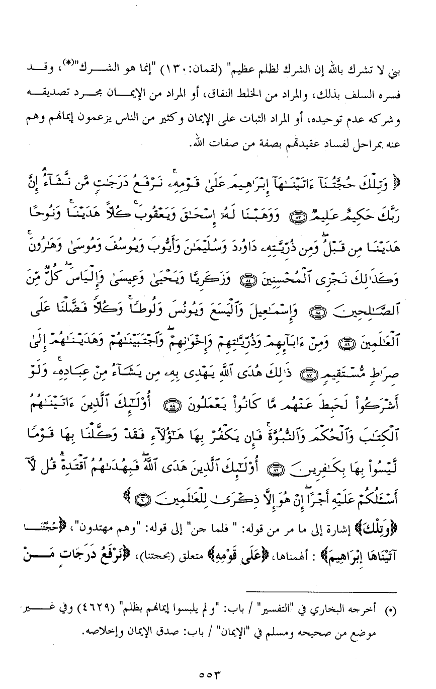 (وَتِلْكَ حُجَّتُنَا آتَيْنَاهَا إِبْرَاهِيمَ عَلَى قَوْمِهِ نَرْفَعُ دَرَجَاتٍ مَنْ نَشَاءُ إِنَّ رَبَّكَ حَكِيمٌ عَلِيمٌ (83) وَوَهَبْنَا لَهُ إِسْحَاقَ وَيَعْقُوبَ كُلًّا هَدَيْنَا وَنُوحًا هَدَيْنَا مِنْ قَبْلُ وَمِنْ ذُرِّيَّتِهِ دَاوُودَ وَسُلَيْمَانَ وَأَيُّوبَ وَيُوسُفَ وَمُوسَى وَهَارُونَ وَكَذَلِكَ نَجْزِي الْمُحْسِنِينَ (84) وَزَكَرِيَّا وَيَحْيَى وَعِيسَى وَإِلْيَاسَ كُلٌّ مِنَ الصَّالِحِينَ (85) وَإِسْمَاعِيلَ وَالْيَسَعَ وَيُونُسَ وَلُوطًا وَكُلًّا فَضَّلْنَا عَلَى الْعَالَمِينَ (86) وَمِنْ آبَائِهِمْ وَذُرِّيَّاتِهِمْ وَإِخْوَانِهِمْ وَاجْتَبَيْنَاهُمْ وَهَدَيْنَاهُمْ إِلَى صِرَاطٍ مُسْتَقِيمٍ (87) ذَلِكَ هُدَى اللهِ يَهْدِي بِهِ مَنْ يَشَاءُ مِنْ عِبَادِهِ وَلَوْ أَشْرَكُوا لَحَبِطَ عَنْهُمْ مَا كَانُوا يَعْمَلُونَ (88) أُولَئِكَ الَّذِينَ آتَيْنَاهُمُ الْكِتَابَ وَالْحُكْمَ وَالنُّبُوَّةَ فَإِنْ يَكْفُرْ بِهَا هَؤُلَاءِ فَقَدْ وَكَّلْنَا بِهَا قَوْمًا لَيْسُوا بِهَا بِكَافِرِينَ (89) أُولَئِكَ الَّذِينَ هَدَى اللهُ فَبِهُدَاهُمُ اقْتَدِهْ قُلْ لَا أَسْأَلُكُمْ عَلَيْهِ أَجْرًا إِنْ هُوَ إِلَّا ذِكْرَى لِلْعَالَمِينَ (90)