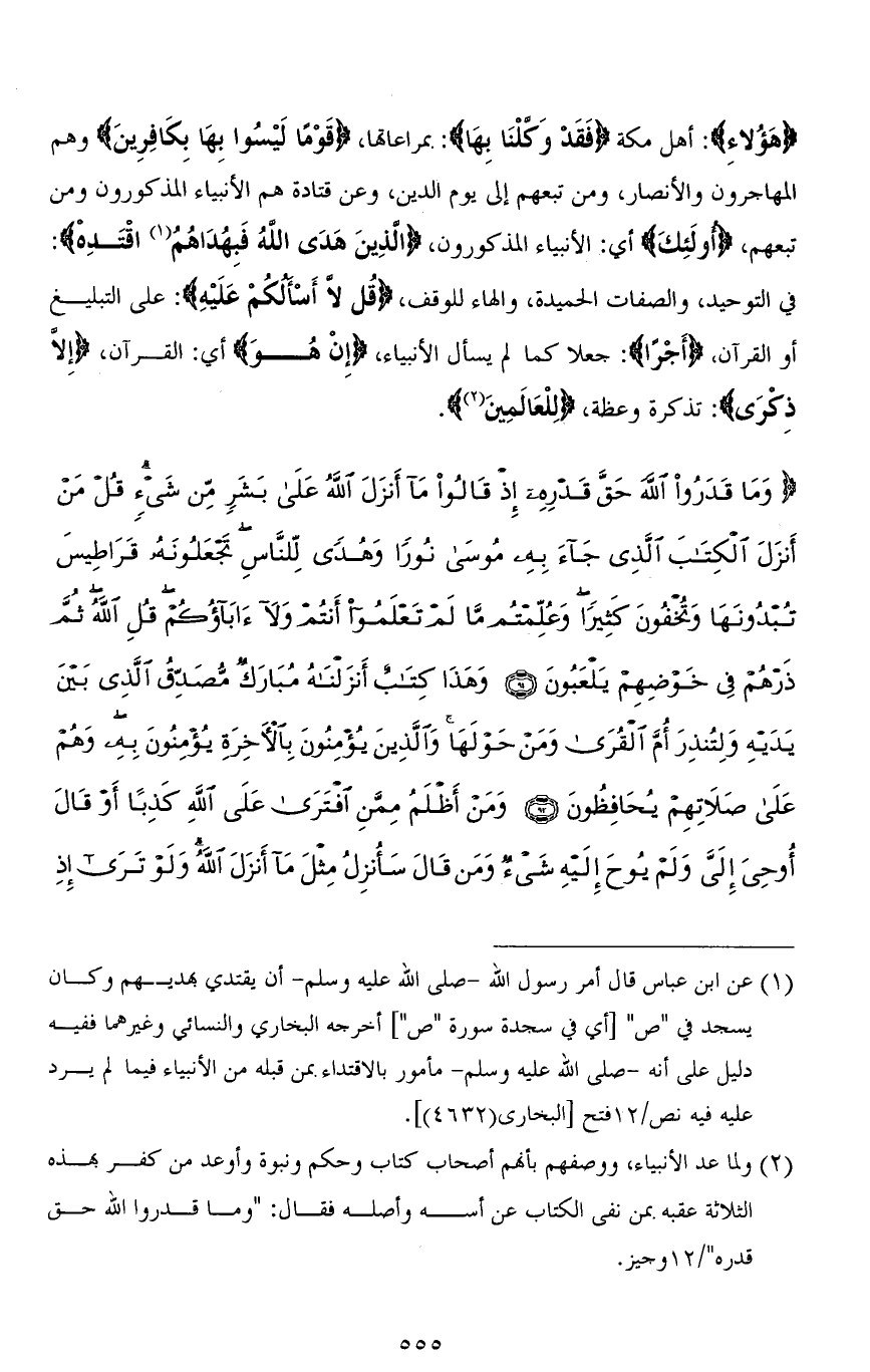 (وَمَا قَدَرُوا اللهَ حَقَّ قَدْرِهِ إِذْ قَالُوا مَا أَنْزَلَ اللهُ عَلَى بَشَرٍ مِنْ شَيْءٍ قُلْ مَنْ أَنْزَلَ الْكِتَابَ الَّذِي جَاءَ بِهِ مُوسَى نُورًا وَهُدًى لِلنَّاسِ تَجْعَلُونَهُ قَرَاطِيسَ تُبْدُونَهَا وَتُخْفُونَ كَثِيرًا وَعُلِّمْتُمْ مَا لَمْ تَعْلَمُوا أَنْتُمْ وَلَا آبَاؤُكُمْ قُلِ اللهُ ثُمَّ ذَرْهُمْ فِي خَوْضِهِمْ يَلْعَبُونَ (91) وَهَذَا كِتَابٌ أَنْزَلْنَاهُ مُبَارَكٌ مُصَدِّقُ الَّذِي بَيْنَ يَدَيْهِ وَلِتُنْذِرَ أُمَّ الْقُرَى وَمَنْ حَوْلَهَا وَالَّذِينَ يُؤْمِنُونَ بِالْآخِرَةِ يُؤْمِنُونَ بِهِ وَهُمْ عَلَى صَلَاتِهِمْ يُحَافِظُونَ (92) وَمَنْ أَظْلَمُ مِمَّنِ افْتَرَى عَلَى اللهِ كَذِبًا أَوْ قَالَ أُوحِيَ إِلَيَّ وَلَمْ يُوحَ إِلَيْهِ شَيْءٌ وَمَنْ قَالَ سَأُنْزِلُ مِثْلَ مَا أَنْزَلَ اللهُ وَلَوْ تَرَى إِذِ