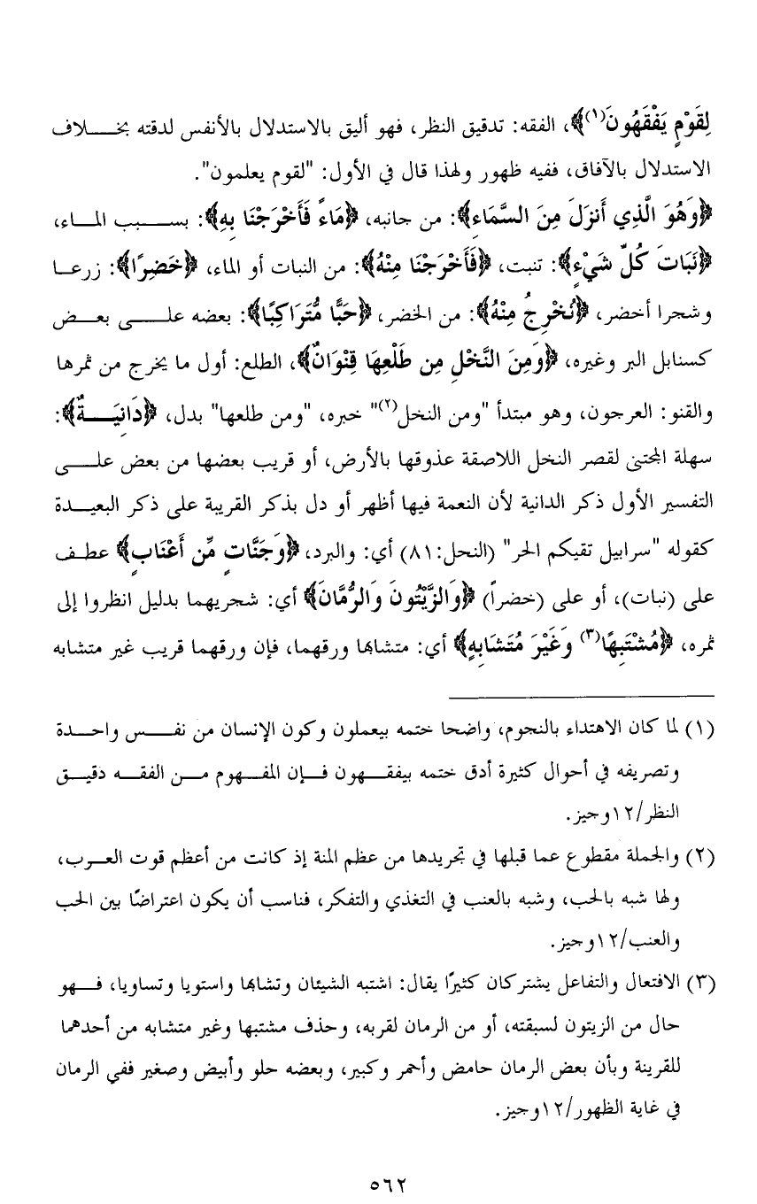 (وَهُوَ الَّذِي أَنزَلَ مِنَ السَّمَاءِ): من جانبه، (مَاءً فَأَخْرَجْنَا بِه): بسبب الماء، (نَبَاتَ كُلِّ شَيْءٍ): تنبت، (فَأَخْرَجْنَا مِنْهُ): من النبات أو الماء، (خَضِرًا): زرعًا وشجرًا أخضر، (نُخْرِجُ مِنْهُ): من الخضر، (حَبًّا مُتَرَاكِبًا): بعضه على بعض كسنابل البر وغيره، (وَمِنَ النَّخْلِ مِنْ طَلْعِهَا قِنْوَانٌ)، الطلع: أول ما يخرج من ثمرها والقنو: العرجون، وهو مبتدأ " ومن النخل " خبره، " ومن طلعها " بدل، (دَانيَةٌ): سهلة المجتنى لقصر النخل اللاصقة عذوقها بالأرض، أو قريب بعضها من بعض على التفسير الأول ذكر الدانية لأن النعمة فيها أظهر أو دل بذكر القريبة على ذكر البعيدة كقوله " سَرَابِيلَ تَقِيكُمُ الْحَرَّ " [النحل: 81] أي: والبرد، (وَجَنَّاتٍ من أَعْنَابٍ) عطف على (نبات)، أو على (خضراً) (وَالزَّيتونَ وَالرُّمَّانَ) أي: شجريهما بدليل انظروا إلى ثمره، (مُشْتَبِهًا وَغَيْرَ مُتَشَابِهٍ) أي: متشابهًا ورقهما، فإن ورقهما قريب غير متشابه