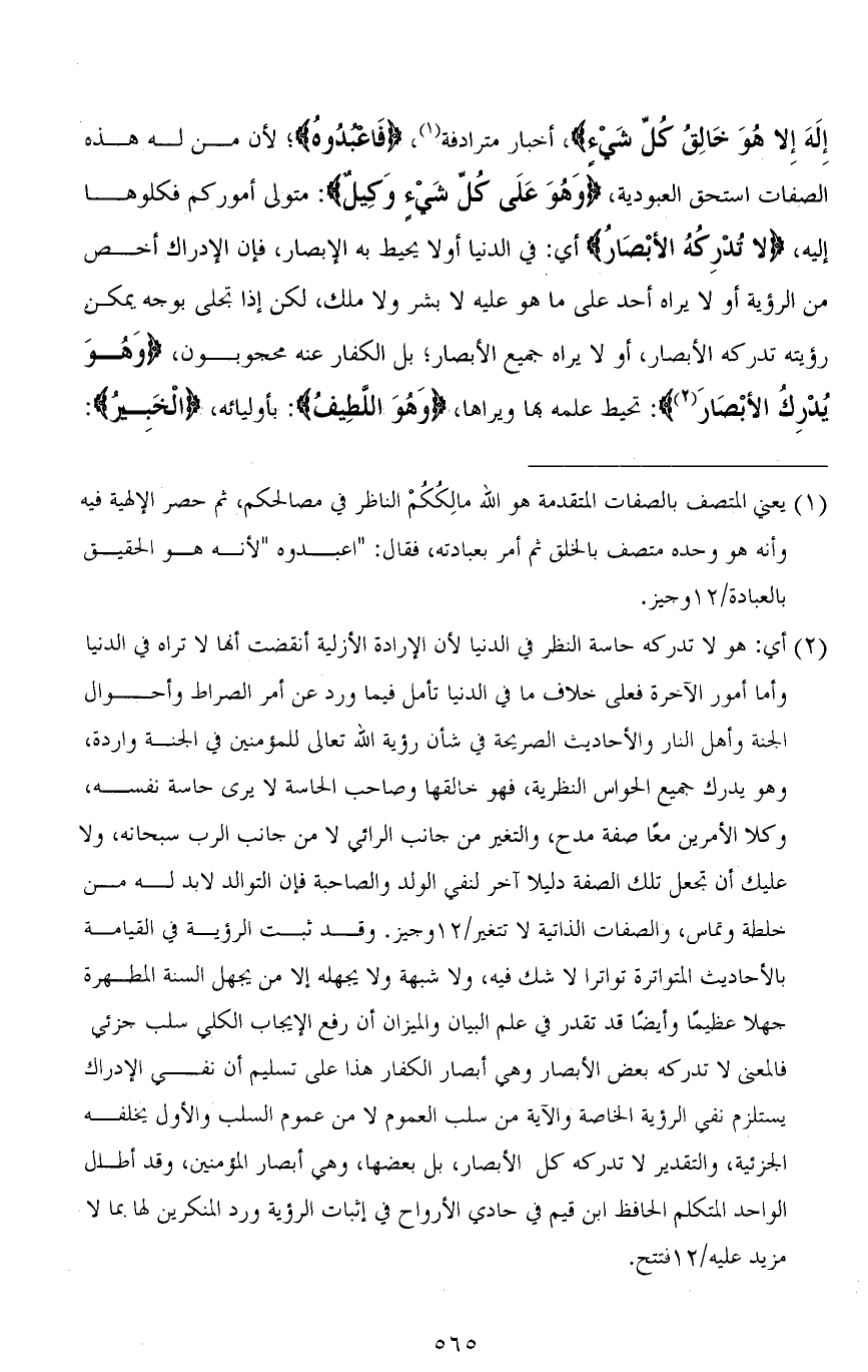 لَا إِلَهَ إِلَّا هُوَ خَالِقُ كُلِّ شَيْءٍ)، أخبار مترادفة، (فَاعْبُدُوهُ)؛ لأن من له هذه الصفات استحق العبودية، (وَهُوَ عَلَى كُلِّ شَيْءٍ وَكِيلٌ): متولي أموركم فكلوها إليه، (لَا تُدْرِكُهُ الْأَبْصَارُ) أي: في الدنيا أو لا يحيط به الإبصار، فإن الإدراك أخص من الرؤية أو لا يراه أحد على ما هو عليه لا بشر ولا ملك، لكن إذا تجلى بوجه يمكن رؤيته تدركه الأبصار، أو لا يراه جميع الأبصار؛ بل الكفار عنه محجوبون، (وَهُوَ يُدْرِكُ الْأَبْصَارَ): يحيط علمه بها ويراها، (وَهُوَ اللَّطِيفُ): بأوليائه، (الْخَبِيرُ):
