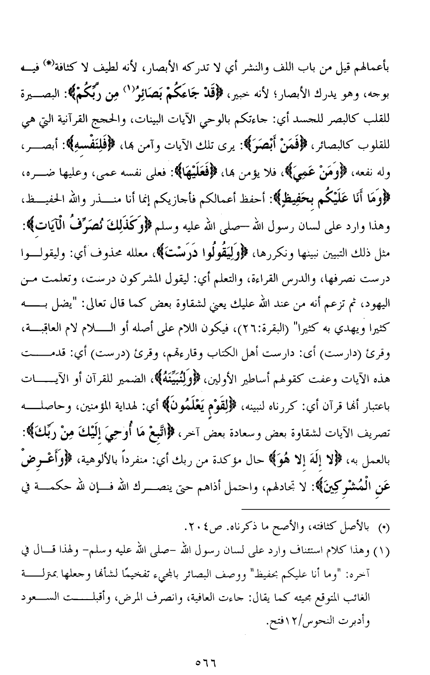 بأعمالهم قيل من باب اللف والنشر أي لا تدركه الأبصار، لأنه لطيف لا كثافة فيه بوجه، وهو يدرك الأبصار؛ لأنه خبير، (قَدْ جَاءَكُمْ بَصَائِرُ مِنْ رَبِّكُمْ): البصيرة للقلب كالبصر للجسد أي: جاءتكم بالوحي الآيات البينات، والحجج القرآنية التي هي للقلوب كالبصائر، (فَمَنْ أَبْصَرَ): يرى تلك الآيات وآمن بها، (فَلِنَفْسِهِ): أبصر، وله نفعه، (وَمَنْ عَمِيَ)، فلا يؤمن بها، (فَعَلَيْهَا): فعلى نفسه عمى، وعليها ضره، (وَمَا أَنَا عَلَيْكم بِحَفِيظٍ): أحفظ أعمالكم فأجازيكم إنما أنا منذر والله الحفيظ، وهذا وارد على لسان رسول الله - صلى الله عليه وسلم (وَكَذَلِكَ نُصَرِّفُ الْآيَاتِ): مثل ذلك التبيين نبينها ونكررها، (وَلِيَقُولُوا دَرَسْتَ)، معلله محذوف أي: وليقولوا درست نصرفها، والدرس القراءة، والتعلم أي: ليقول المشركون درست، وتعلمت من اليهود، ثم تزعم أنه من عند الله عليك يعني لشقاوة بعض كما قال تعالى: " يضل به كثيرًا ويهدي به كثيرًا " [البقرة: 26]، فيكون اللام على أصله أو اللام لام العاقبة، وقرئ (دارست) أي: دارست أهل الكتاب وقارءتهم، وقرئ (دَرَسَتْ) أي: قدمت هذه الآيات وعفت كقولهم أساطير الأولين، (وَلِنُبَيِّنَهُ)، الضمير للقرآن أو الآيات باعتبار أنها قرآن أي: كررناه لنبينه، (لِقَوْمٍ يَعْلَمُونَ) أي: لهداية المؤمنين، وحاصله تصريف الآيات لشقاوة بعض وسعادة بعض آخر، (اتَّبِعْ مَا أُوحِيَ إِلَيْكَ مِنْ رَبِّكَ): بالعمل به، (لَا إِلَهَ إِلَّا هُوَ) حال مؤكدة (مِنْ رَبِّكَ) أي: منفرداً بالألوهية، (وَأَعْرِضْ عَنِ الْمُشْرِكِينَ: لا تجادلهم، واحتمل أذاهم حتى ينصرك الله فإن لله حكمة في