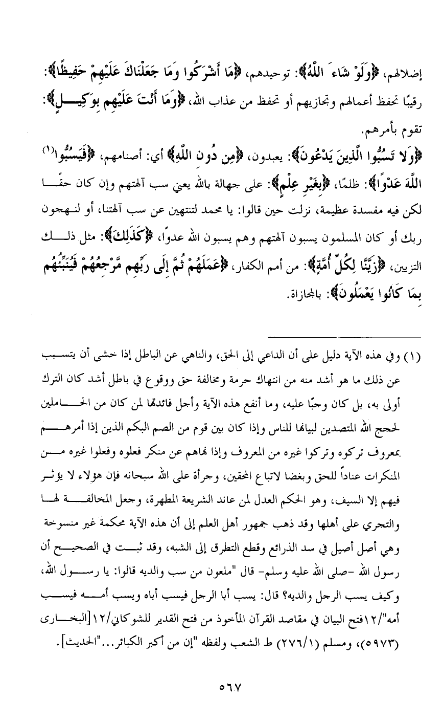 (وَلَا تَسُبُّوا الَّذِينَ يَدْعُونَ): يعبدون، (مِن دُون اللهِ) أي: أصنامهم، (فَيَسُبُّوا اللهَ عَدْوًا): ظلمًا، (بِغَيْرِ عِلْمٍ): على جهالة بالله يعني سب آلهتهم، وإن كان حقًا لكن فيه مفسدة عظيمة، نزلت حين قالوا: يا محمد لتنتهين عن سب آلهتنا، أو لنهجون ربك أو كان المسلمون يسبون آلهتهم وهم يسبون الله عدوًا، (كَذَلِكَ): مثل ذلك التزيين، (زَيَّنَّا لِكُلِّ أُمَّةٍ): من أمم الكفار، (عَمَلَهُمْ ثُمَّ إِلَى رَبِّهِمْ مَرْجِعُهُمْ فَيُنَبِّئُهُمْ بِمَا كَانُوا يَعْمَلُونَ): بالمجازاة.