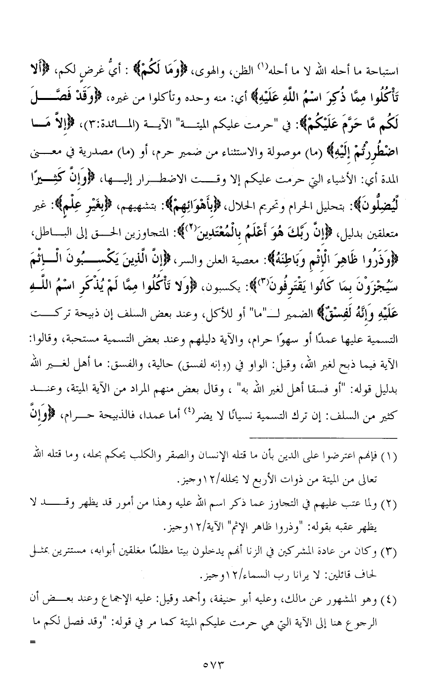 استباحة ما أحله الله لا ما أحله الظن، والهوى، (وَمَا لَكُمْ): أيُّ غرضٍ لكم، (أَلَّا تَأْكلُوا مِمَّا ذُكِرَ اسْمُ اللهِ عَلَيْهِ) أي: منه وحده وتأكلوا من غيره، (وَقَدْ فَصَّلَ لَكُمْ مَا حَرَّمَ عَلَيْكُمْ): في " حرمت عليكم الميتة " الآية [المائدة: 3]، (إِلَّا مَا اضْطُرِرْتُمْ إِلَيْهِ) (ما) موصولة والاستثناء من ضمير حرم، أو (ما) مصدرية في معنى المدة أي: الأشياء التي حرمت عليكم إلا وقت الاضطرار إليها، (وَإِنْ كثِيرًا لَّيُضِلونَ): بتحليل الحرام وتحريم الحلال، (بِأَهْوَائِهِمْ): بتشهيهم، (بِغَيْرِ عِلْمٍ): غير متعلقين بدليل، (إِنَّ رَبَّكَ هُوَ أَعْلَمُ بِالْمُعْتَدِينَ): المتجاوزين الحق إلى الباطل، (وَذَرُوا ظَاهِرَ الْإِثْمِ وَبَاطِنَهُ): معصية العلن والسر، (إِنَّ الَّذِينَ يَكْسِبُونَ الْإِثْمَ سَيُجْزَوْنَ بِمَا كَانُوا يَقْتَرِفُونَ): يكسبون، (وَلَا تَأْكُلُوا مِمَّا لَمْ يُذْكَرِ اسْمُ اللهِ عَلَيْهِ وَإِنَّهُ لَفِسْقٌ) الضمير لـ " ما " أو للأكل، وعند بعض السلف إن ذبيحة تركت التسمية عليها عمدًا أو سهوًا حرام، والآية دليلهم وعند بعض التسمية مستحبة، وقالوا: الآية فيما ذبح لغير الله، وقيل: الواو في (وإنه لفسق) حالية، والفسق: ما أهل لغير الله بدليل قوله: " أَوْ فِسْقًا أُهِلَّ لِغَيْرِ اللهِ بِهِ "، وقال بعض منهم المراد من الآية الميتة، وعند كثير من السلف: إن ترك التسمية نسيانًا لا يضر أما عمدًا، فالذبيحة حرام، (وَإِنَّ