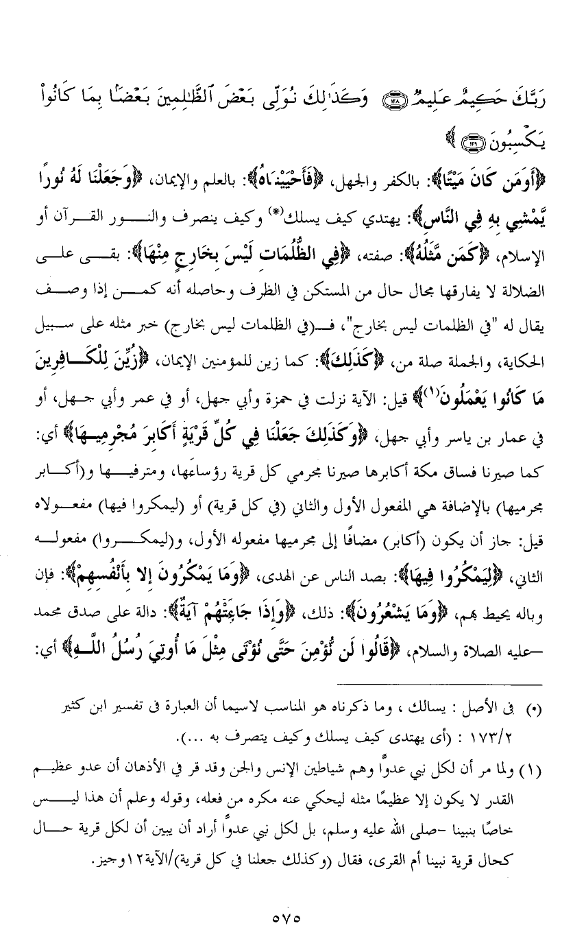 (أَوَمَنْ كَانَ مَيْتًا): بالكفر والجهل، (فَأَحْيَيْنَاهُ): بالعلم والإيمان، (وَجَعَلْنَا لَهُ نُورًا يَمْشِي بِهِ فِي النَّاسِ): يهتدي كيف يسلك وكيف ينصرف والنور القرآن أو الإسلام، (كَمَنْ مَثَلُهُ): صفته، (فِي الظُّلُمَاتِ لَيْسَ بِخَارِجٍ مِنْهَا): بقي على الضلالة لا يفارقها بحال حال من المستكن في الظرف وحاصله أنه كمن إذا وصف يقال له " في الظلمات ليس بخارج "، فـ (في الظلمات ليس بخارج) خبر مثله على سبيل الحكاية، والجملة صلة من، (كَذَلِكَ): كما زين للمؤمنين الإيمان، (زُيِّنَ لِلْكَافِرِينَ مَا كَانُوا يَعْمَلُونَ) قيل: الآية نزلت في حمزة وأبي جهل، أو في عمر وأبي جهل، أو في عمار بن ياسر وأبي جهل، (وَكَذَلِكَ جَعَلْنَا فِي كُلِّ قَرْيَةٍ أَكَابِرَ مُجْرِمِيهَا) أي: كما صيرنا فساق مكة أكابرها صيرنا مجرمي كل قرية رؤساءَها، ومترفيها و (أكابر مجرميها) بالإضافة هي المفعول الأول والثاني (في كل قرية) أو (ليمكروا فيها) مفعولاه قيل: جاز أن يكون (أكابر) مضافًا إلى مجرميها مفعوله الأول، و (ليمكروا) مفعوله الثاني، (لِيَمْكُرُوا فِيهَا): لصد الناس عن الهدى، (وَمَا يَمْكُرُونَ إِلَّا بِأَنْفُسِهِمْ): فإن وباله يحيط بهم، (وَمَا يَشْعُرُون): ذلك، (وَإِذَا جَاءَتْهُمْ آيَةٌ): دالة على صدق محمد عليه الصلاة والسلام، (قَالُوا لَنْ نُؤْمِنَ حَتَّى نُؤْتَى مِثْلَ مَا أُوتِيَ رُسُلُ اللهِ) أي:
