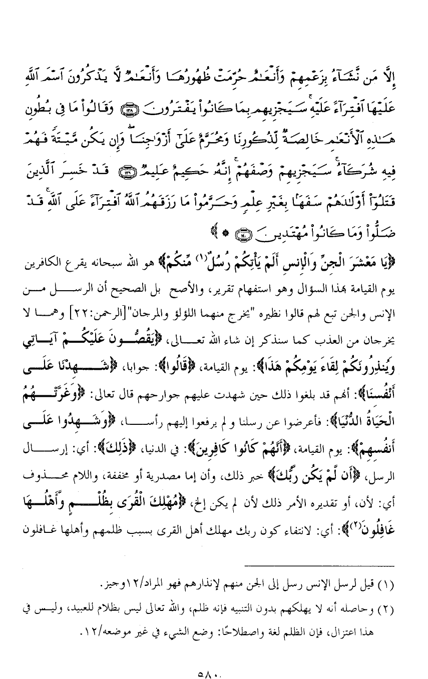 (يَا مَعْشَرَ الْجِنِّ وَالْإِنسِ أَلَمْ يَأتِكُمْ رُسُلٌ مِّنكُمْ) هو الله سبحانه يقرع الكافرين يوم القيامة بهذا السؤال وهو استفهام تقرير، والأصح بل الصحيح أن الرسل من الإنس والجن تبع لهم قالوا نظيره " يخرج منهما اللؤلؤ والمرجان " [الرحمن: 22] وهما لا يخرجان من العذب كما سنذكر إن شاء الله تعالى، (يَقُصُّونَ عَلَيْكُمْ آيَاتِي وَيُنْذِرُونَكُمْ لِقَاءَ يَوْمِكُمْ هَذَا): يوم القيامة، (قَالُوا): جوابًا، (شَهِدْنَا عَلَى أَنْفُسِنَا): أنَّهم قد بلغوا ذلك حين شهدت عليهم جوارحهم قال تعالى: (وَغَرَّتْهُمُ الْحَيَاةُ الدُّنْيَا): فأعرضوا عن رسلنا ولم يرفعوا إليهم رأسا، (وَشَهِدُوا عَلَى أَنْفُسِهِمْ): يوم الميامة، (أَنَّهُمْ كَانُوا كَافِرِينَ): في الدنيا، (ذَلِكَ): أي: إرسال الرسل، (أَن لَمْ يَكُن ربُّكَ) خبر ذلك، وأن إما مصدرية أو مخففة، واللام محذوف أي: لأن، أو تقديره الأمر ذلك لأن لم يكن إلخ، (مُهْلِكَ الْقرَى بِظُلْمٍ وأَهْلُهَا غافِلُونَ): أي: لانتفاء كون ربك مهلك أهل القرى بسبب ظلمهم وأهلها غافلون