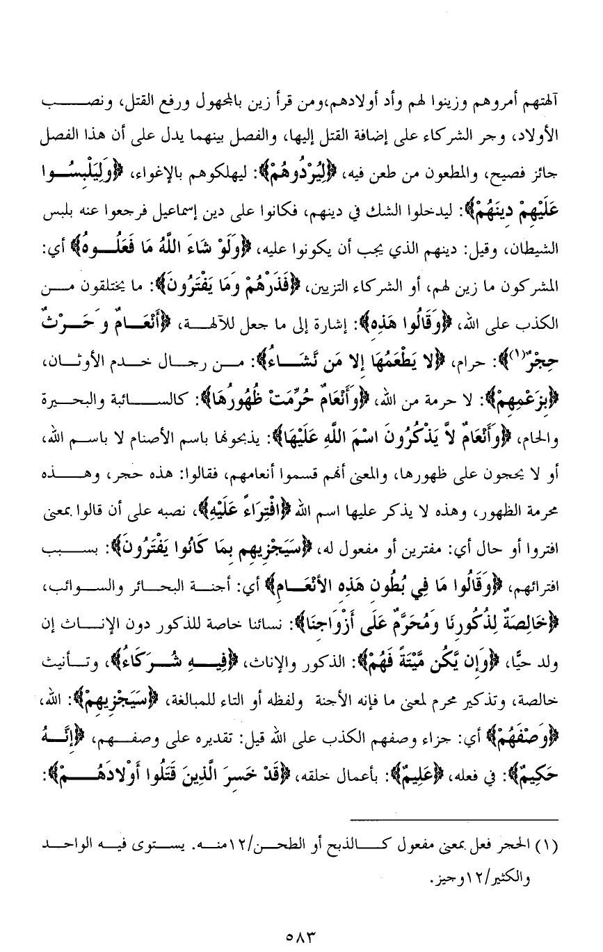 آلهتهم أمروهم وزينوا لهم وأد أولادهم، ومن قرأ (زُيَّنَ) بالمجهول ورفع القتل، ونصب الأولاد، وجر الشركاء على إضافة القتل إليها، والفصل بينهما يدل على أن هذا الفصل جائز فصيح، والمطعون من طعن فيه، (لِيُرْدُوهُمْ): ليهلكوهم بالإغواء، (وَلِيَلْبِسُوا عَلَيْهِمْ دِينَهُمْ): ليدخلوا الشك في دينهم، فكانوا على دين إسماعيل فرجعوا عنه بلبس الشيطان، وقيل: دينهم الذي يجب أن يكونوا عليه، (وَلَوْ شَاءَ اللهُ مَا فَعَلُوهُ) أي: المشركون ما زين لهم، أو الشركاء التزيين، (فَذَرْهُمْ وَمَا يَفْتَرُونَ): ما يختلقون من الكذب على الله، (وَقَالُوا هَذِهِ): إشارة إلى مما جعل للآلهة، (أَنْعَامٌ وَحَرْثٌ حِجْرٌ): حرام، (لَا يَطْعَمُهَا إِلَّا مَنْ نَشَاءُ): من رجال خدم الأوثان، (بِزَعْمِهِمْ): لا حرمة من الله، (وَأَنْعَامٌ حُرِّمَتْ ظُهُورُهَا): كالسائبة والبحيرة والحام، (وَأَنْعَامٌ لَا يَذْكُرُونَ اسْمَ اللهِ عَلَيْهَا): يذبحونها باسم الأصنام لا باسم الله، أو لا يحجون على ظهورها، والمعنى أنهم قسموا أنعامهم، فقالوا: هذه حجر، وهذه محرمة الظهور، وهذه لا يذكر عليها اسم الله (افْتِرَاءً عَلَيْهِ)، نصبه على أن قالوا بمعنى افتروا أو حال أي: مفترين أو مفعول له، (سَيَجْزِيهِم بِمَا كَانُوا يَفْتَرُونَ): بسبب افترائهم، (وَقَالُوا مَا فِي بُطُونِ هَذِهِ الأنعَامِ) أي: أجنة البحائر والسوائب، (خَالِصَةٌ لِذُكُورِنَا وَمُحَرَّمٌ عَلَى أَزْوَاجِنَا): نسائنا خاصة للذكور دون الإناث إن ولد حيًّا، (وَإِن يَّكُن مَّيْتَةً فَهُمْ): الذكور والإناث، (فِيهِ شُرَكَاءُ)، وتأنيث خالصة، وتذكير محرم لمعنى ما فإنه الأجنة ولفظه أو التاء للمبالغة، (سَيَجْزِيهِمْ): الله، (وَصْفَهُمْ) أي: جزاء وصفهم الكذب على الله قيل: تقديره على وصفهم، (إِنَّهُ حَكِيمٌ): في فعله، (عَلِيمٌ): بأعمال خلقه، (قَدْ خَسِرَ الَّذِينَ قَتَلُوا أَوْلادَهُمْ):