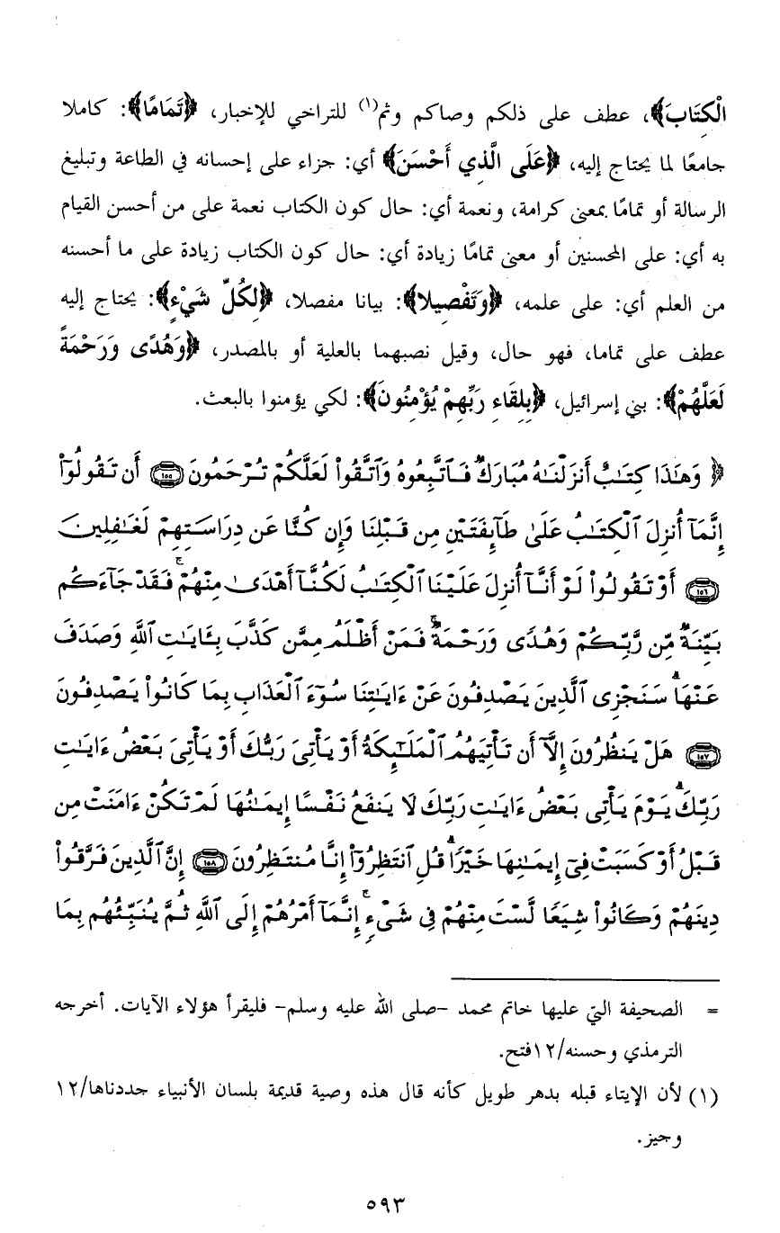 (وَهَذَا كِتَابٌ أَنْزَلْنَاهُ مُبَارَكٌ فَاتَّبِعُوهُ وَاتَّقُوا لَعَلَّكُمْ تُرْحَمُونَ (155) أَنْ تَقُولُوا إِنَّمَا أُنْزِلَ الْكِتَابُ عَلَى طَائِفَتَيْنِ مِنْ قَبْلِنَا وَإِنْ كُنَّا عَنْ دِرَاسَتِهِمْ لَغَافِلِينَ (156) أَوْ تَقُولُوا لَوْ أَنَّا أُنْزِلَ عَلَيْنَا الْكِتَابُ لَكُنَّا أَهْدَى مِنْهُمْ فَقَدْ جَاءَكُمْ بَيِّنَةٌ مِنْ رَبِّكُمْ وَهُدًى وَرَحْمَةٌ فَمَنْ أَظْلَمُ مِمَّنْ كَذَّبَ بِآيَاتِ اللهِ وَصَدَفَ عَنْهَا سَنَجْزِي الَّذِينَ يَصْدِفُونَ عَنْ آيَاتِنَا سُوءَ الْعَذَابِ بِمَا كَانُوا يَصْدِفُونَ (157) هَلْ يَنْظُرُونَ إِلَّا أَنْ تَأْتِيَهُمُ الْمَلَائِكَةُ أَوْ يَأْتِيَ رَبُّكَ أَوْ يَأْتِيَ بَعْضُ آيَاتِ رَبِّكَ يَوْمَ يَأْتِي بَعْضُ آيَاتِ رَبِّكَ لَا يَنْفَعُ نَفْسًا إِيمَانُهَا لَمْ تَكُنْ آمَنَتْ مِنْ قَبْلُ أَوْ كَسَبَتْ فِي إِيمَانِهَا خَيْرًا قُلِ انْتَظِرُوا إِنَّا مُنْتَظِرُونَ (158) إِنَّ الَّذِينَ فَرَّقُوا دِينَهُمْ وَكَانُوا شِيَعًا لَسْتَ مِنْهُمْ فِي شَيْءٍ إِنَّمَا أَمْرُهُمْ إِلَى اللهِ ثُمَّ يُنَبِّئُهُمْ بِمَا