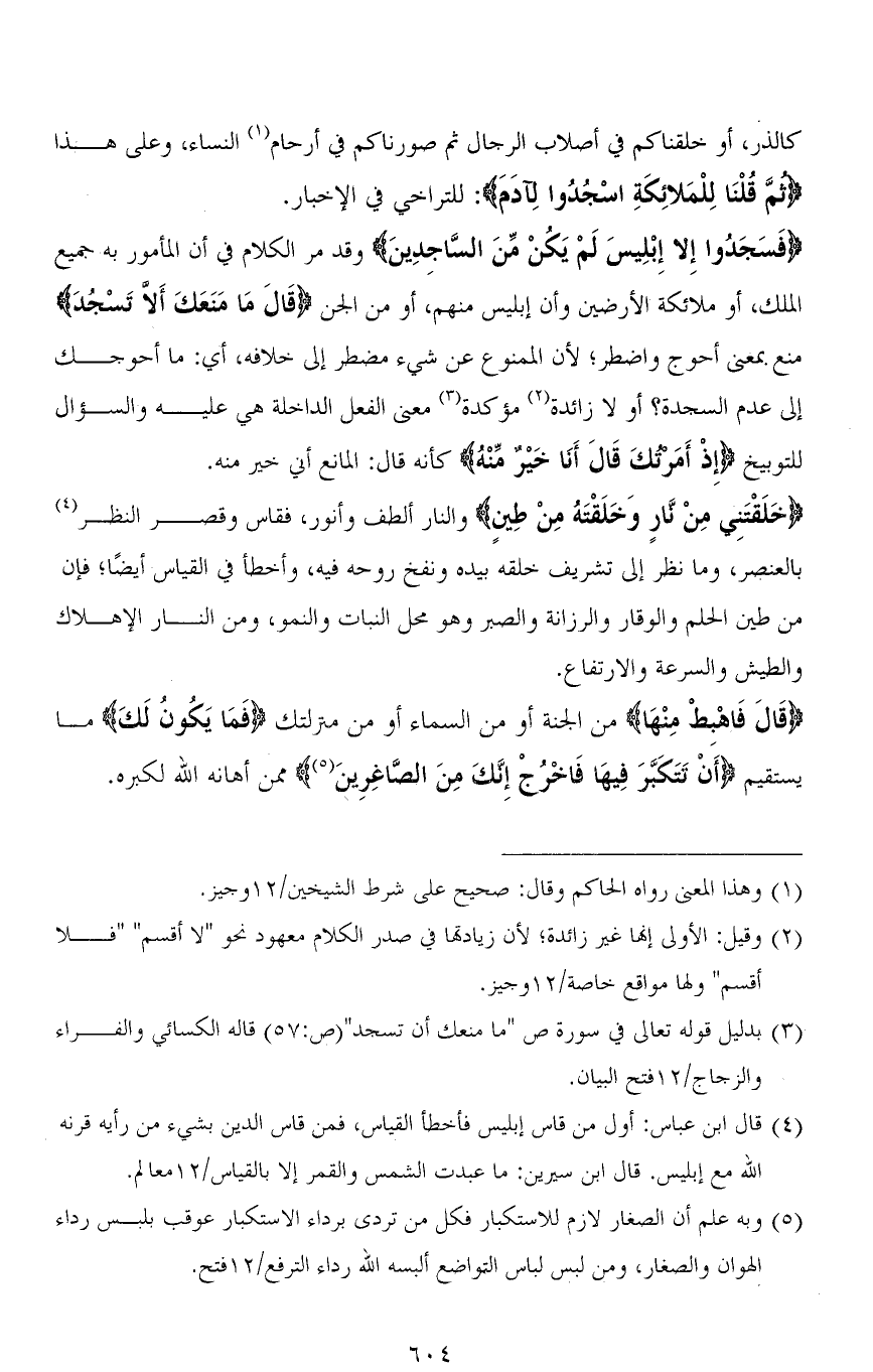 (خَلَقْتَنِي مِنْ نَارٍ وَخَلَقْتَهُ مِنْ طِينٍ) والنار ألطف وأنور، فقاس وقصر النظر بالعنصر، وما نظر إلى تشريف خلقه بيده ونفخ روحه فيه، وأخطأ في القياس أيضًا؛ فإن (مِنْ طِينٍ) الحلم والوقار والرزانة والصبر وهو محل النبات والنمو، ومن النار الإهلاك والطيش والسرعة والارتفاع.