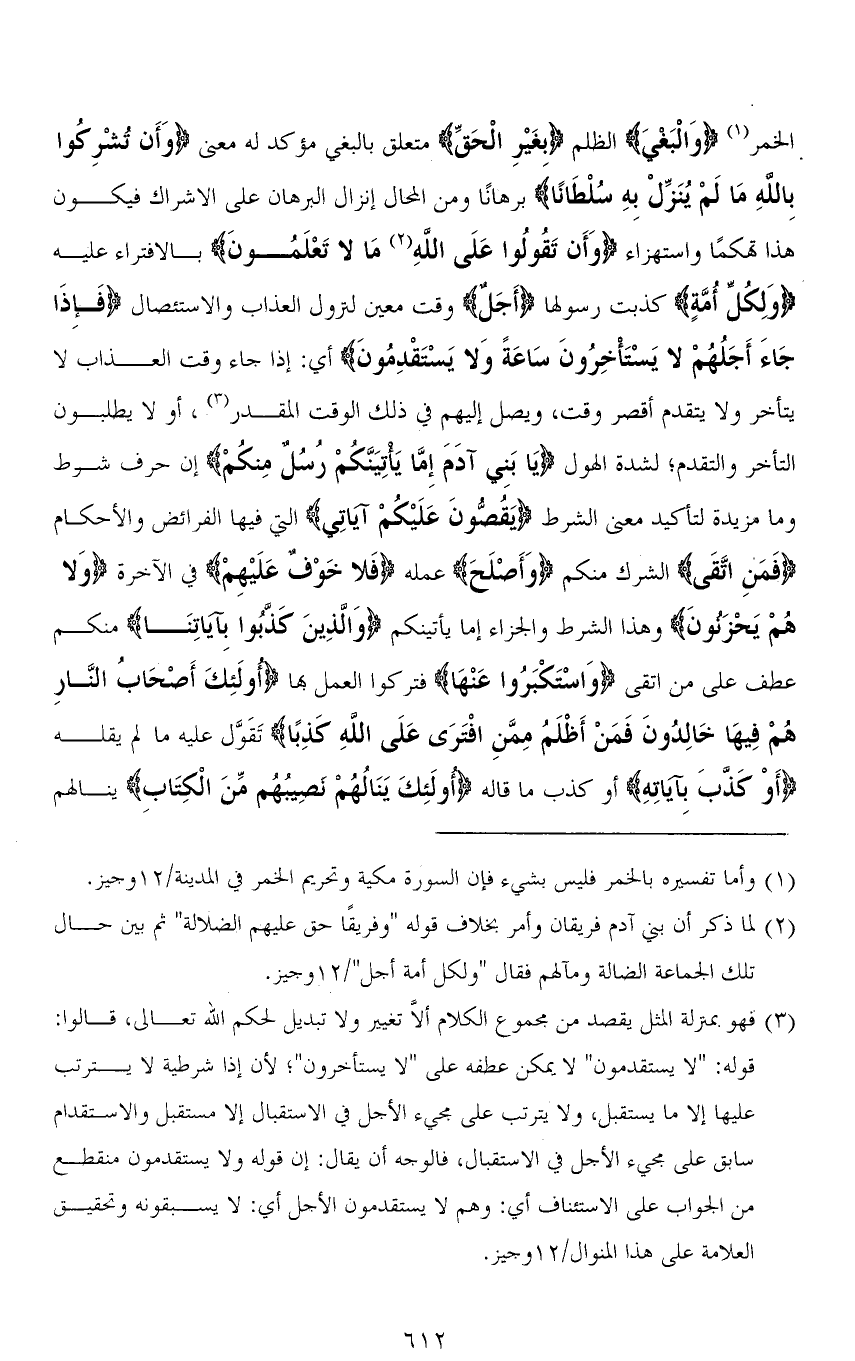 الخمر (وَالْبَغْيَ) الظلم (بِغَيْرِ الْحَقِّ) متعلق بالبغي مؤكد له معنى (وَأَنْ تُشْرِكُوا بِاللهِ مَا لَمْ يُنَزِّلْ بِهِ سُلْطَانًا) برهانًا ومن المحال إنزال البرهان على الإشراك فيكون هذا تهكمًا واستهزاء (وَأَنْ تَقُولُوا عَلَى اللهِ مَا لَا تَعْلَمُونَ) بالافتراء عليه (وَلِكُلِّ أُمَّةٍ) كذبت رسولها (أَجَلٌ) وقت معين لنزول العذاب والاستئصال (فَإِذَا جَاءَ أَجَلُهُمْ لَا يَسْتَأْخِرُونَ سَاعَةً وَلَا يَسْتَقْدِمُونَ) أي: إذا جاء وقت العذاب لا يتأخر ولا يتقدم أقصر وقت، ويصل إليهم في ذلك الوقت المقدر، أو لا يطلبون التأخر والتقدم؛ لشدة الهول (يَا بَنِي آدَمَ إِمَّا يَأْتِيَنَّكُمْ رُسُلٌ مِنْكُمْ) إن حرف شرط وما مزيدة لتأكيد معنى الشرط (يَقُصُّونَ عَلَيْكُمْ آيَاتِي) التي فيها الفرائض والأحكام (فَمَنِ اتَّقَى) الشرك منكم (وَأَصْلَحَ) عمله (فَلا خَوْفٌ عَلَيْهِمْ) في الآخرة (وَلا هُمْ يَحْزنونَ) وهذا الشرط والجزاء إما يأتينكم (وَالّذِينَ كَذَّبُوا بِآيَاتِنَا) منكم عطف على من اتقى (وَاستَكْبَرُوا عَنْهَا) فتركوا العمل بها (أُولَئِكَ أَصْحَابُ النَّارِ هُمْ فِيهَا خَالِدُونَ فَمَنْ أَظْلَمُ مِمَّنِ افْتَرَى عَلَى اللهِ كَذِبًا) تَقَوَّل عليه ما لم يقله (أَوْ كَذَّبَ بِآيَاتِهِ) أو كذب ما قاله (أُولَئِكَ يَنَالُهُمْ نَصِيبُهُمْ مِنَ الْكِتَابِ) ينالهم