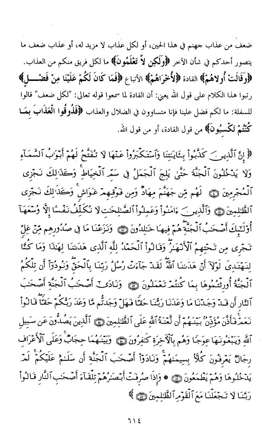 (إِنَّ الَّذِينَ كَذَّبُوا بِآيَاتِنَا وَاسْتَكْبَرُوا عَنْهَا لَا تُفَتَّحُ لَهُمْ أَبْوَابُ السَّمَاءِ وَلَا يَدْخُلُونَ الْجَنَّةَ حَتَّى يَلِجَ الْجَمَلُ فِي سَمِّ الْخِيَاطِ وَكَذَلِكَ نَجْزِي الْمُجْرِمِينَ (40) لَهُمْ مِنْ جَهَنَّمَ مِهَادٌ وَمِنْ فَوْقِهِمْ غَوَاشٍ وَكَذَلِكَ نَجْزِي الظَّالِمِينَ (41) وَالَّذِينَ آمَنُوا وَعَمِلُوا الصَّالِحَاتِ لَا نُكَلِّفُ نَفْسًا إِلَّا وُسْعَهَا أُولَئِكَ أَصْحَابُ الْجَنَّةِ هُمْ فِيهَا خَالِدُونَ (42) وَنَزَعْنَا مَا فِي صُدُورِهِمْ مِنْ غِلٍّ تَجْرِي مِنْ تَحْتِهِمُ الْأَنْهَارُ وَقَالُوا الْحَمْدُ لله الَّذِي هَدَانَا لِهَذَا وَمَا كُنَّا لِنَهْتَدِيَ لَوْلَا أَنْ هَدَانَا اللهُ لَقَدْ جَاءَتْ رُسُلُ رَبِّنَا بِالْحَقِّ وَنُودُوا أَنْ تِلْكُمُ الْجَنَّةُ أُورِثْتُمُوهَا بِمَا كُنْتُمْ تَعْمَلُونَ (43) وَنَادَى أَصْحَابُ الْجَنَّةِ أَصْحَابَ النَّارِ أَنْ قَدْ وَجَدْنَا مَا وَعَدَنَا رَبُّنَا حَقًّا فَهَلْ وَجَدْتُمْ مَا وَعَدَ رَبُّكُمْ حَقًّا قَالُوا نَعَمْ فَأَذَّنَ مُؤَذِّنٌ بَيْنَهُمْ أَنْ لَعْنَةُ اللهِ عَلَى الظَّالِمِينَ (44) الَّذِينَ يَصُدُّونَ عَنْ سَبِيلِ اللهِ وَيَبْغُونَهَا عِوَجًا وَهُمْ بِالْآخِرَةِ كَافِرُونَ (45) وَبَيْنَهُمَا حِجَابٌ وَعَلَى الْأَعْرَافِ رِجَالٌ يَعْرِفُونَ كُلًّا بِسِيمَاهُمْ وَنَادَوْا أَصْحَابَ الْجَنَّةِ أَنْ سَلَامٌ عَلَيْكُمْ لَمْ يَدْخُلُوهَا وَهُمْ يَطْمَعُونَ (46) وَإِذَا صُرِفَتْ أَبْصَارُهُمْ تِلْقَاءَ أَصْحَابِ النَّارِ قَالُوا رَبَّنَا لَا تَجْعَلْنَا مَعَ الْقَوْمِ الظَّالِمِينَ (47)