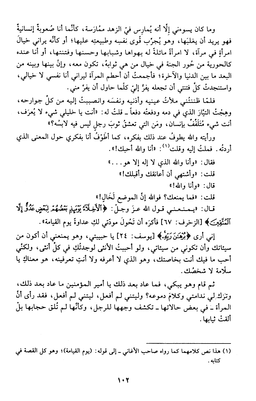 وما كان يسوءني إلا أنه يمارس في الزهد ممارسة، كأنما أنا صعوبة إنسانية فهو يريد أن يغلبها، وهو يجرب قوى نفسه وطبيعته عليها؛ أو كأنه يراني خيال امرأة في مرآة، لا امرأة مائلة له بهواها وشبابها وحسنها وفتنتها، أو أنا عنده كالحورية من حور الجنة في خيال من هي ثوابه، تكون معه، وإن بينها وبينه من البعد ما بين الدنيا والآخرة، فأجمعتُ أن أحطم المرآة ليراني أنا نفسي لا خيالي، واستنجدت كل فتنتي أن تجعله يفر إلي كلما حاول أن يفر مني.