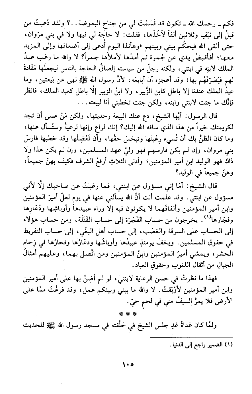قال الشيخ: أما أني مسئول عن ابنتي، فما رغبت عن صاحبك إلا لأني مسئول عن ابنتي. وقد علمت أنت أن الله يسألني عنها في يوم لعل أمير المؤمنين وابن أمير المؤمنين وألفافهما لا يكونون فيه إلا وراء عبيدها وأوباشها ودعارها وفجارها1. يخرجون من حساب الفجرة إلى حساب القتلة، ومن حساب هؤلاء إلى الحساب على السرقة والغصب، إلى حساب أهل البغي، إلى حساب التفريط في حقوق المسلمين. ويخف يومئذ عبيدها وأوباشها ودعارها وفجارها في زحام الحشر، ويمشي أمير المؤمنين وابن أمير المؤمنين ومن اتصل بهما، وعليهم أمثال الجبال من أثقال الذنوب وحقوق العباد.