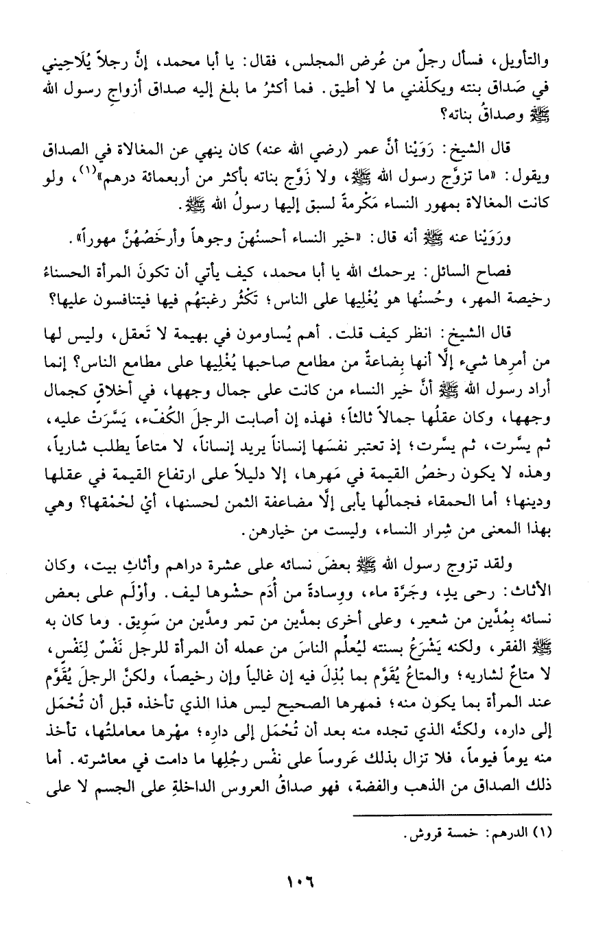 قال الشيخ: انظر كيف قلت, أهم يساومون في بهيمة لا تعقل، وليس لها من أمرها شيء إلا أنها بضاعة من مطامع صاحبها يغليها على مطامع الناس؟ إنما أراد رسول الله -صلى الله عليه وسلم- أن خير النساء من كانت على جمال وجهها، في أخلاق كجمال وجهها، وكان عقلها جمالًا ثالثًا؛ فهذه إن أصابت الرجل الكفء، يسرت عليه، ثم يسرت، ثم يسرت؛ إذ تعتبر نفسها إنسانًا يريد إنسانًا، لا متاعًا يطلب شاريًا، وهذه لا يكون رخص القيمة في مهرها، إلا دليلًا على ارتفاع القيمة في عقلها ودينها؛ أما الحمقاء فجمالها يأبى إلا مضاعفة الثمن لحسنها، أي: لحمقها, وهي بهذا المعنى من شرار النساء، وليست من خيارهن.