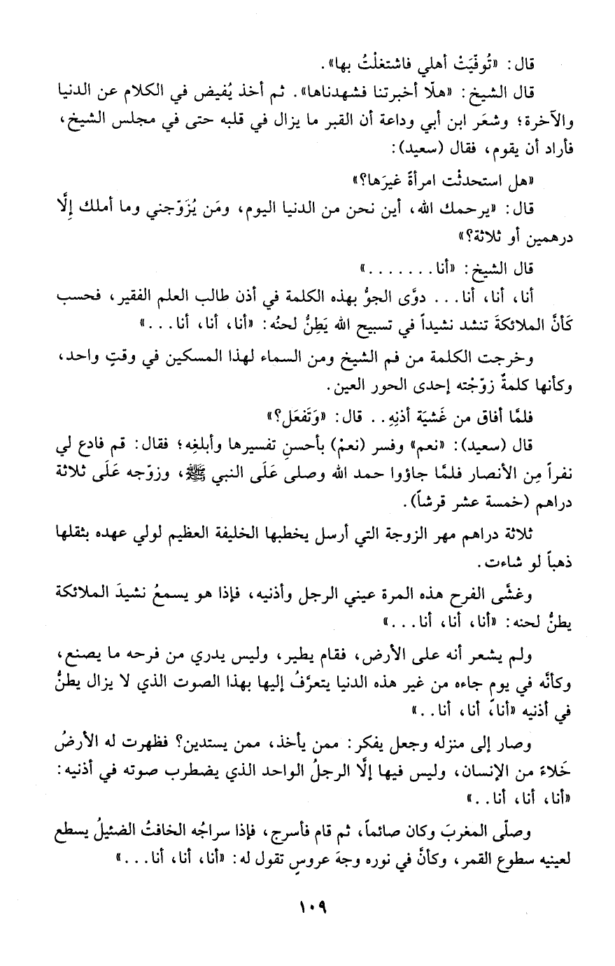 وخرجت الكلمة من فم الشيخ ومن السماء لهذا المسكين في وقت واحد، وكأنها كلمة زوجته إحدى الحور العين.