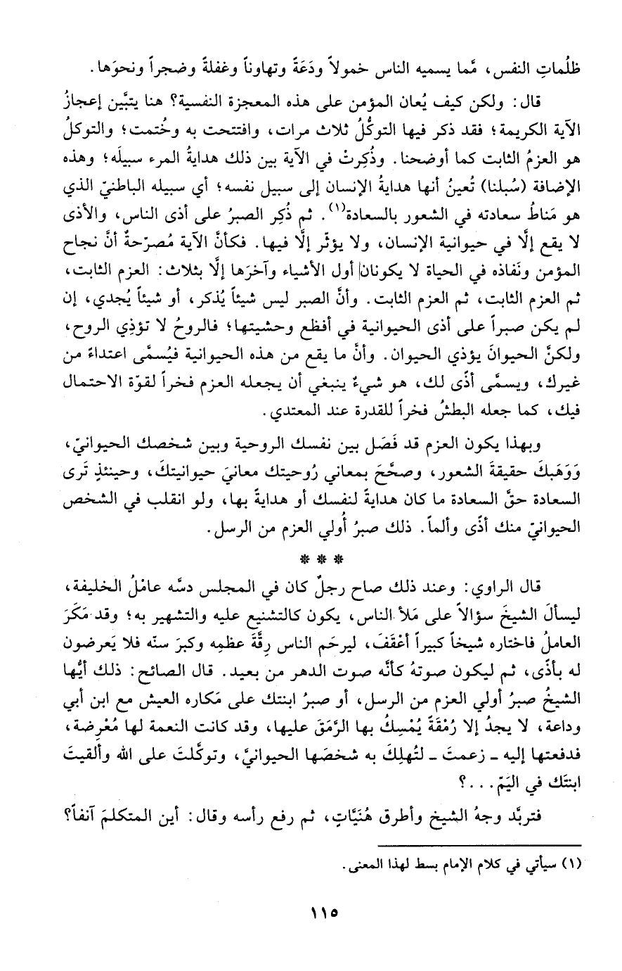 وبهذا يكون العزم قد فصل بين نفسك الروحية وبين شخصك الحيواني، ووهبك حقيقة الشعور، وصحح بمعاني روحيتك معاني حيوانيتك، وحينئذ ترى السعادة حق السعادة ما كان هداية لنفسك أو هداية بها، ولو انقلب في الشخص الحيواني منك أذًى وألمًا. ذلك صبر أولي العزم من الرسل.