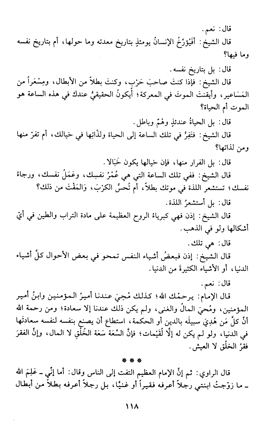 قال الإمام: يرحمك الله؛ كذلك مُحي عندنا أمير المؤمنين وابن أمير المؤمنين، ومحي المال والغنى، ولم يكن ذلك عندنا إلا سعادة؛ ومن رحمة الله أن كل من هدي سبيله بالدين أو الحكمة، استطاع أن يصنع بنفسه لنفسه سعادتها في الدنيا، ولو لم يكن له إلا لقيمات؛ فإن السعة سعة الخلق لا المال، وإن الفقر فقر الخُلُق لا العيش.