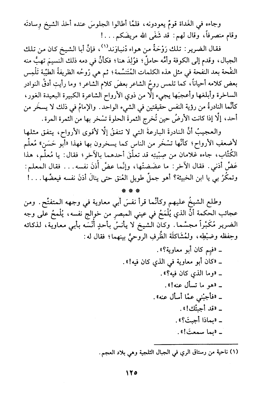 فقال الضرير: تلك رَوْحَة من هواء دُنباوَند1، فإن أبا الشيخ كان من تلك الجبال، وقدم إلى الكوفة وأمه حامل؛ فوُلد هنا؛ فكأن في دمه ذلك النسيم تهب منه النفحة بعد النفحة في مثله هذه الكلمات المتنسمة؛ ثم هي روحه الظريفة الطيبة تلمس بعض كلامه أحيانًا، كما تلمس روح الشاعر بعض كلام الشاعر؛ وما رأيت أدق النوادر الساخرة وأبلغها وأعجبها يجيء إلا من ذوي الأرواح الشاعرة الكبيرة البعيدة الغور، كأنما النادرة من رؤية النفس حقيقتان في الشيء الواحد. والإمام في ذلك لا يسخر من أحد، إلا إذا كانت الأرض حين تخرج الثمرة الحلوة تسخر بها من الثمرة المرة.