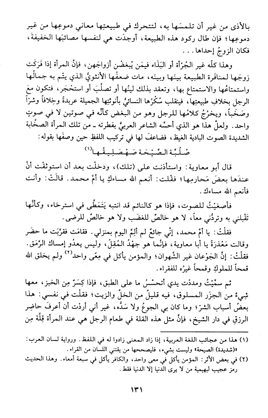 فقلت: يا أم محمد، إني جائع لم ألم اليوم بمنزلي. فقامت فقربت ما حضر وقالت: معذرة يا أبا معاوية، فإنما هو جهد المقل، وليس يعدو إمساك الرمق. فقلت: إن الجوعان غير الشهوان؛ والمؤمن يأكل في معًى واحد2 ولم يخلق الله قمحًا للملوك وقمحًا غيره للفقراء.