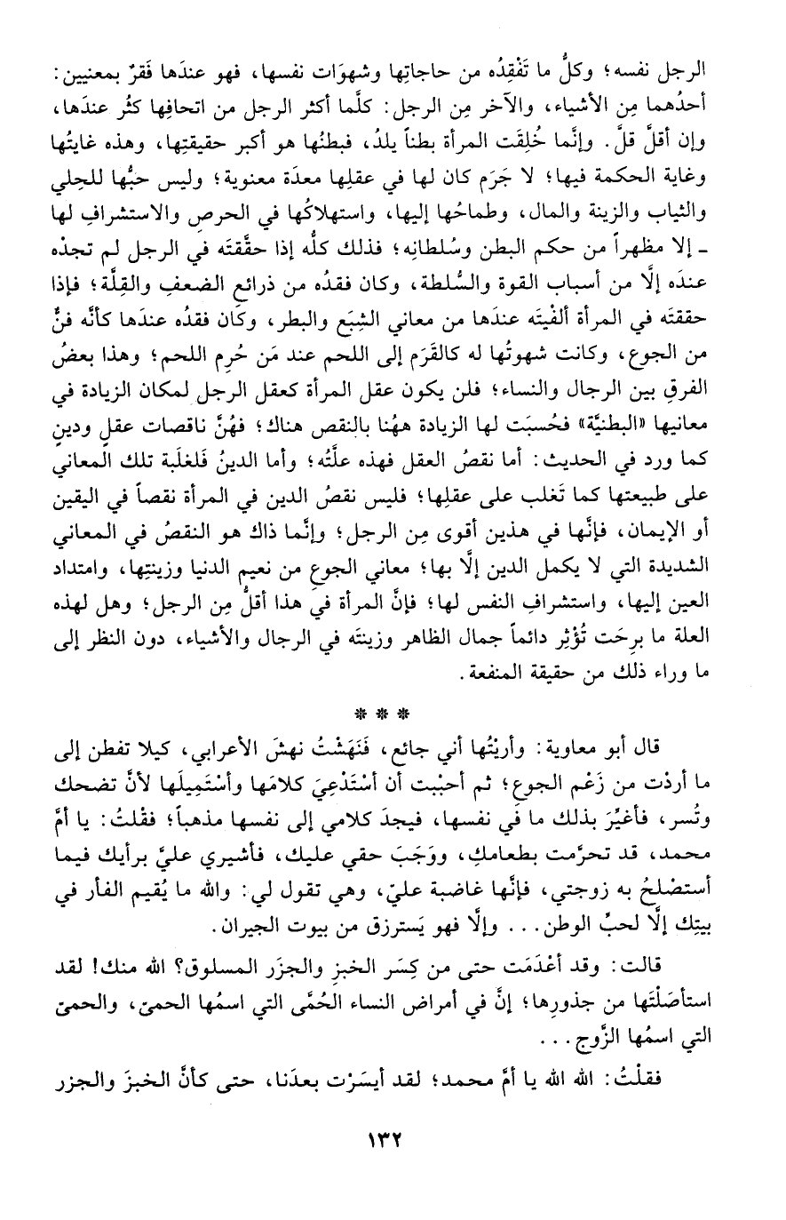 الرجل نفسه؛ وكل ما تفقده من حاجاتها وشهوات نفسها، فهو عندها فقر بمعنيين: أحدهما من الأشياء، والآخر من الرجل. كلما أكثر الرجل من إتحافها كثر عندها، وإن أقل قل. وإنما خلقت المرأة بطنًا يلد، فبطنها هو أكبر حقيقتها، وهذه غايتها وغاية الحكمة فيها؛ لا جرم كان لها في عقلها معدة معنوية؛ وليس حبها للحلي والثياب والزينة والمال، وطماحها إليها، واستهلاكها في الحرص والاستشراف لها, إلا مظهرًا من حكم البطن وسلطانه؛ فذلك كله إذا حققته في الرجل لم تجده عنده إلا من أسباب القوة والسلطة، وكان فقده من ذرائع الضعف والقلة؛ فإذا حققته في المرأة ألفيته عندها من معاني الشبع والبطر، وكان فقده عندها كأنه فن من الجوع، وكانت شهوتها له كالقرم إلى اللحم عند من حُرِم اللحم؛ وهذا بعض الفرق بين الرجال والنساء؛ فلن يكون عقل المرأة كعقل الرجل لمكان الزيادة في معانيها "البطنية" فحُسبت لها الزيادة ههنا بالنقص هناك؛ فهن ناقصات عقل ودين كما ورد في الحديث. أما نقص العقل فهذه علته؛ وأما الدين فلغلبة تلك المعاني على طبيعتها كما تغلب على عقلها؛ فليس نقص الدين في المرأة نقصًا في اليقين أو الإيمان، فإنها في هذين أقوى من الرجل؛ وإنما ذاك هو النقص في المعاني الشديدة التي لا يكمل الدين إلا بها؛ معاني الجوع من نعيم الدنيا وزينتها، وامتداد العين إليها، واستشراف النفس لها؛ فإن المرأة في هذا أقل من الرجل؛ وهل لهذه العلة ما برحت تُؤْثر دائمًا جمال الظاهر وزينته في الرجال والأشياء، دون النظر إلى ما وراء ذلك من حقيقة المنفعة.