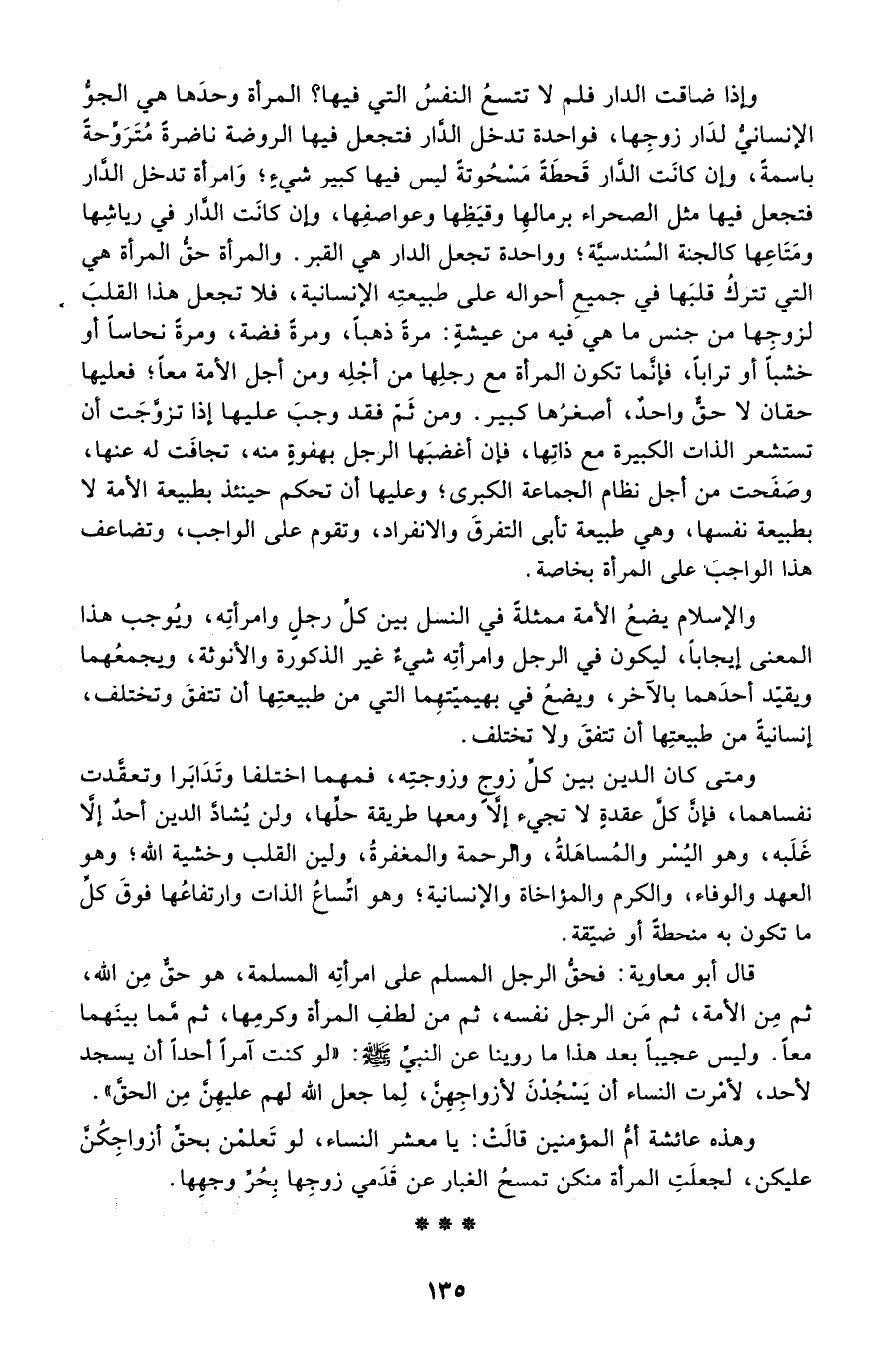 والإسلام يضع الأمة ممثلة في النسل بين كل رجل وامرأته، ويوجب هذا المعنى إيجابًا؛ ليكون في الرجل وامرأته شيء غير الذكورة والأنوثة، ويجمعهما ويقيد أحدهما بالآخر، ويضع في بهيميتهما التي من طبيعتها أن تتفق وتختلف، إنسانية من طبيعتها أن تتفق ولا تختلف.