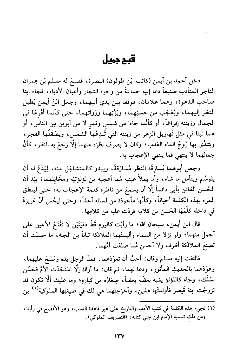 دخل أحمد بن أيمن "كاتب ابن طولون" البصرة، فصنع له مسلم بن عمران التاجر المتأدب صنيعًا دعا إليه جماعة من وجوه التجار وأعيان الأدباء، فجاء ابنا صاحب الدعوة وهما غلامان، فوقفا بين يدي أبيهما، وجعل ابن أيمن يطيل النظر إليهما، ويعجب من حسنهما وبَزَّتهما ورُوائهما، حتى كأنما أفرغا في الجمال وزينته إفراغًا، أو كأنما جاءا من شمس وقمر لا من أبوين من الناس، أو هما نبتا في مثل تهاويل الزهر من زينته التي تُبدعها الشمس، ويصقلها الفجر، ويتندى بها روح الماء العذب؛ وكان لا يصرف نظره عنهما إلا رجع به النظر، كأن جمالهما لا ينتهي فيما ينتهي الإعجاب به.
