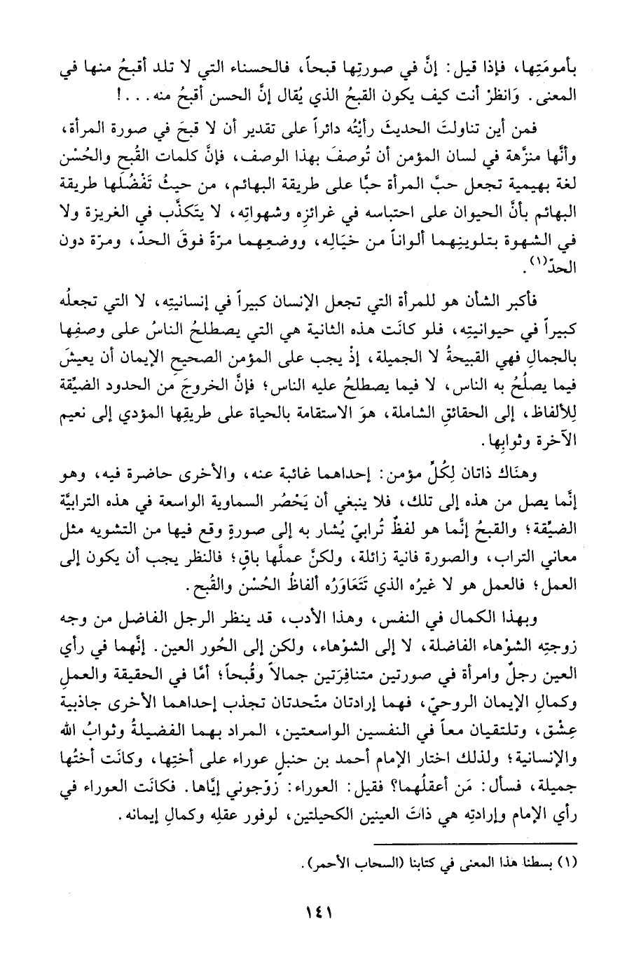 فأكبر الشأن هو للمرأة التي تجعل الإنسان كبيرًا في إنسانيته، لا التي تجعله كبيرًا في حيوانيته، فلو كانت هذه الثانية هي التي يصطلح الناس على وصفها بالجمال فهي القبيحة لا الجميلة، إذ يجب على المؤمن الصحيح الإيمان أن يعيش فيما يصلح به الناس، لا فيما يصطلح عليه الناس؛ فإن الخروج من الحدود الضيقة للألفاظ، إلى الحقائق الشاملة، هو الاستقامة بالحياة على طريقها المؤدي إلى نعيم الآخرة وثوابها.