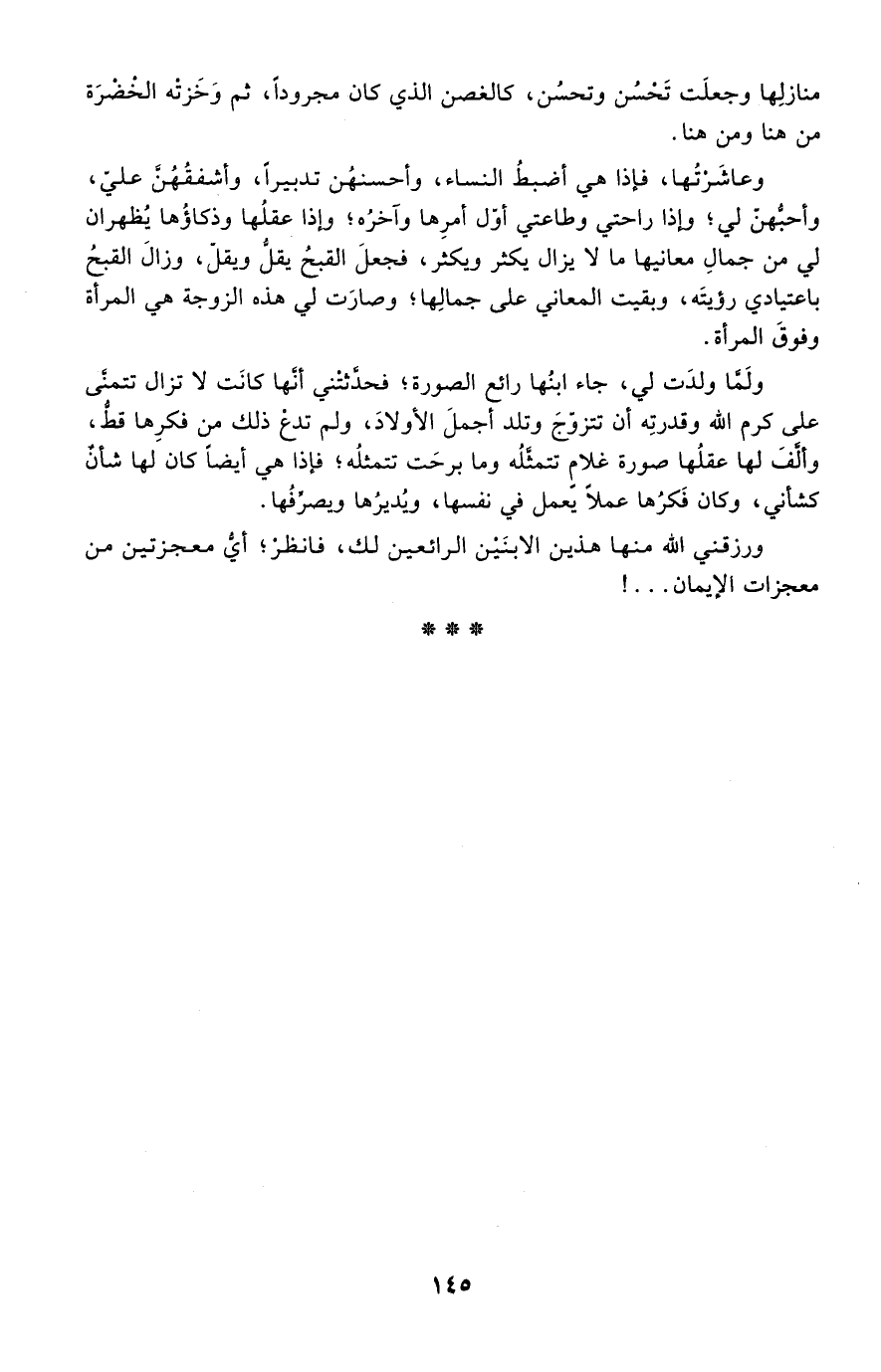 وعاشرتها، فإذا هي أضبط النساء، وأحسنهن تدبيرًا، وأشفقهن علي، وأحبهن لي؛ وإذا راحتي وطاعتي أول أمرها وآخره؛ وإذا عقلها وذكاؤها يظهران لي من جمال معانيها ما لا يزال يكثر ويكثر، فجعل القبح يقل ويقل، وزال القبح باعتيادي رؤيته، وبقيت المعاني على جمالها؛ وصارت لي هذه الزوجة هي المرأة وفوق المرأة.