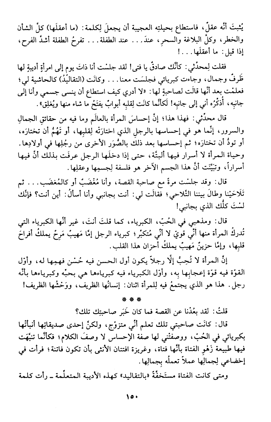 فقلت لمحدثي: كأنك صادق يا فتى! لقد جلست أنا ذات يوم إلى امرأة أديبة لها ظرف وجمال، وجاءت كبريائي فجلست معنا, وكانت "التقاليد" كالحاشية لي؛ فعلمت بعد أنها قالت لصاحبة لها: "لا أدري كيف استطاع أن ينسى جسمي وأنا إلى جانبه، أذكِّره أني إلى جانبه! لكأنما كانت لقلبه أبواب يفتح ما شاء منها ويغلق".