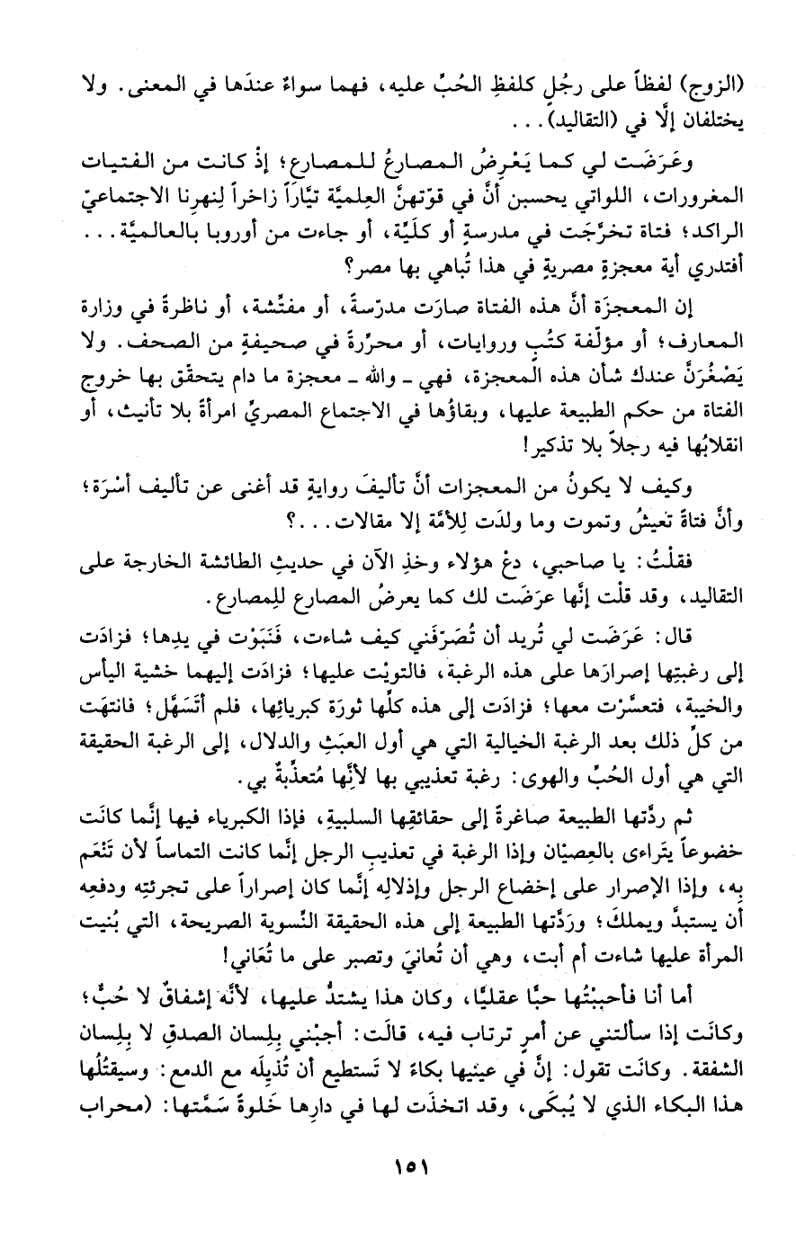 وعرضت لي كما يعرض المصارع للمصارع؛ إذ كانت من الفتيات المغرورات، اللواتي يحسبن أن في قوتهن العلمية تيارًا زاخرًا لنهرنا الاجتماعي الراكد؛ فتاة تخرجت في مدرسة أو كلية، أو جاءت من أوروبا بالعالمية, أفتدري أية معجزة مصرية في هذا تباهي بها مصر؟