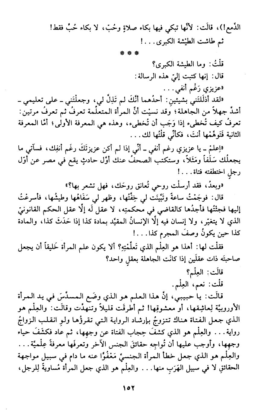 فقلت لها: أهذا هو العلم الذي تعلمتِهِ؟ ألا يكون علم المرأة خليقًا أن يجعل صاحبته ذات عقلين إذا كانت الجاهلة بعقل واحد؟