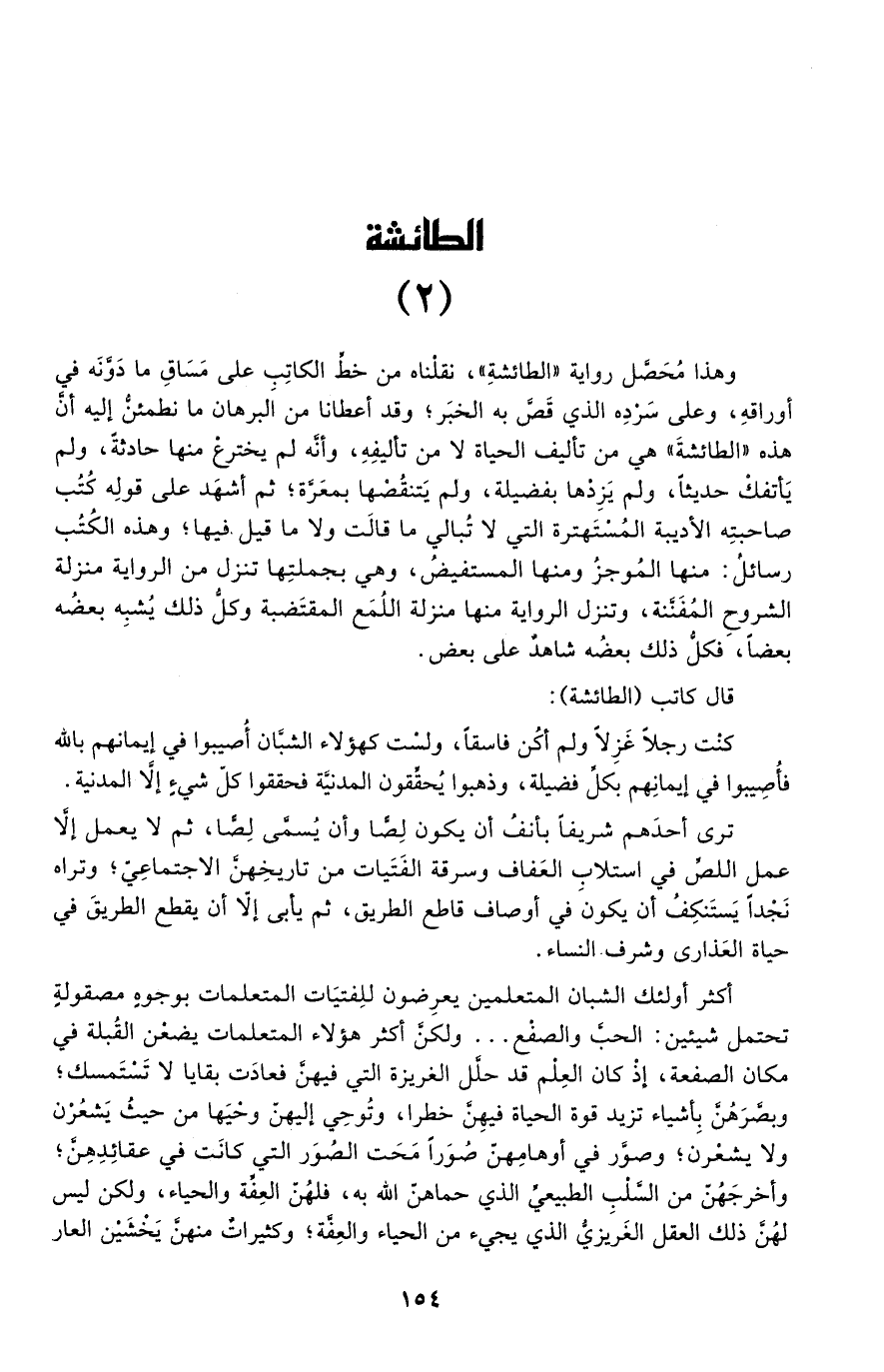وهذا محصل رواية "الطائشة"، نقلناه من خط الكاتب على مساق ما دوّنه في أوراقه، وعلى سرده الذي قص به الخبر؛ وقد أعطانا من البرهان ما نطمئن إليه أن هذه "الطائشة" هي من تأليف الحياة لا من تأليفه، وأنه لم يخترع منها حادثة، ولم يأتفك حديثًا، ولم يزدها بفضيلة، ولم يتنقصها بمعرة؛ ثم أشهد على قوله كتب صاحبته الأدبية المستهترة التي لا تبالي ما قالت ولا ما قيل فيها؛ وهذه الكتب رسائل: منها الموجز ومنها المستفيض، وهي بجملتها تنزل من الرواية منزلة الشروح المفننة، وتنزل الرواية منها منزلة اللُّمَع المقتضبة وكل ذلك يشبه بعضه بعضًا، فكل ذلك بعضه شاهد على بعض.