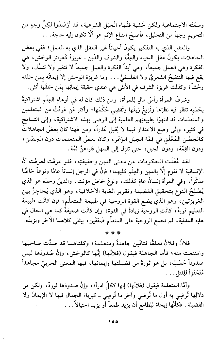 وشرف المرأة رأس مال للمرأة، ومن ذلك كان له في أوهام العلم اشتراكية بحسبه تنظر فيه نظرها وتزيغ زيغها وتقضي حكمها؛ وأكثر من عرفت من المتعلمين والمتعلمات قد انتهوا بطبيعتهم العلمية إلى الرضى بهذه الاشتراكية، وإلى التسامح في كثير، وإلى وضع الاعتذار فيما لا يُقبل عذرًا، ومن ههنا كان بعض الجاهلات كالحصن المغلق في قمة الجبل الوعر، وكان بعض المتعلمات دون الحصن، ودون القمة، ودون الجبل، حتى تنزل إلى السهل فتراهنَّ ثمة.