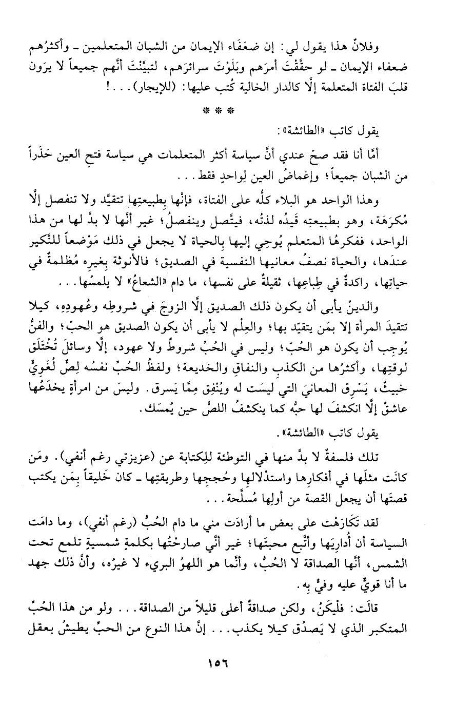 والدين يأبى أن يكون ذلك الصديق إلا الزوج في شروطه وعهوده، كيلا تتقيد المرأة إلا بمن يتقيد بها؛ والعلم لا يأبى أن يكون الصديق هو الحب؛ والفن يوجب أن يكون هو الحب؛ وليس في الحب شروط ولا عهود، إلا وسائل تُختلق لوقتها، وأكثرها من الكذب والنفاق والخديعة؛ ولفظ الحب نفسه لص لغوي خبيث، يسرق المعاني التي ليست له وينفق مما يسرق. وليس من امرأة يخدعها عاشق إلا انكشف لها حبه كما ينكشف اللص حين يُمسَك.