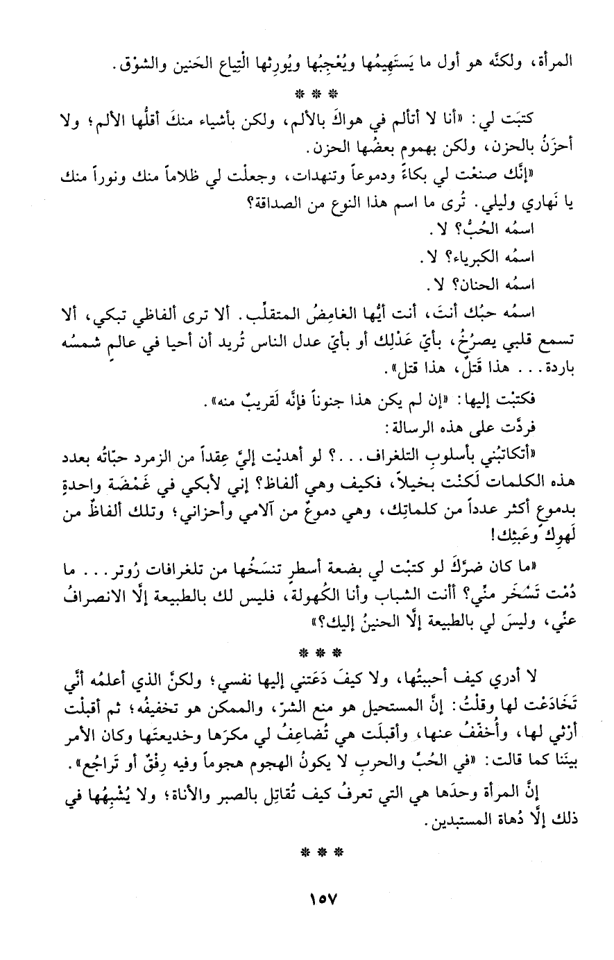 "أتكاتبني بأسلوب التلغراف؟ لو أهديت إلي عِقْدًا من الزمرد حباته بعدد هذه الكلمات لكنت بخيلًا، فكيف وهي ألفاظ؟ إني لأبكي في غمضة واحدة بدموع أكثر عددًا من كلماتك، وهي دموع من آلامي وأحزاني؛ وتلك ألفاظ من لهوك وعبثك! "