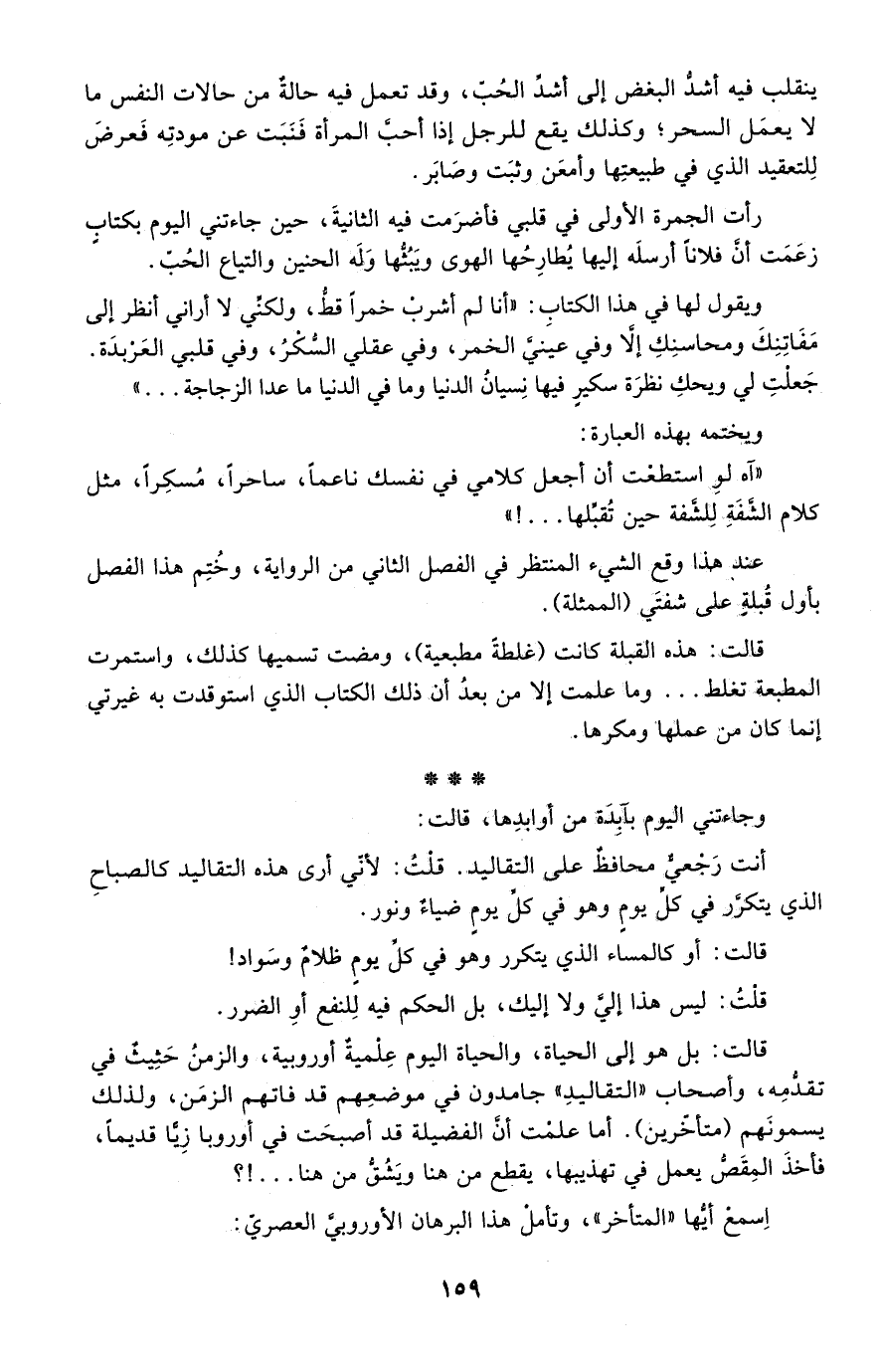 ينقلب فيه أشد البغض إلى أشد الحب، وقد تعمل فيه حالة من حالات النفس ما لا يعمل السحر؛ وكذلك يقع للرجل إذا أحب المرأة فنبت عن مودته فعرض للتعقيد الذي في طبيعتها, وأمعن وثبت وصابر.