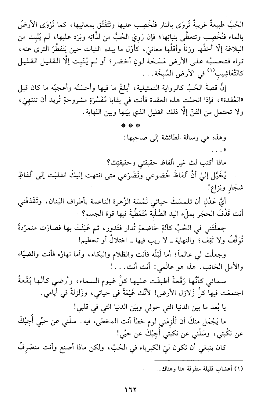 الحب طبيعة غريبة تُرْوَى بالنار فتخصب عليها وتتفتق بمعانيها، كما تروى الأرض بالماء فتخصب وتتغطى بنباتها؛ فإن رَوِيَ الحب من لذاته وبرد عليها، لم ينبت من البلاغة إلا أخفها وزنًا وأقلها معاني، كأول ما يبدو النبات حين يتفطر الثرى عنه، تراه فتحسبه على الأرض مَسْحَة لون أخضر؛ أو لم ينبت إلا القليل القليل كالتَّعَاشِيب1 في الأرض السَّبِخَة.