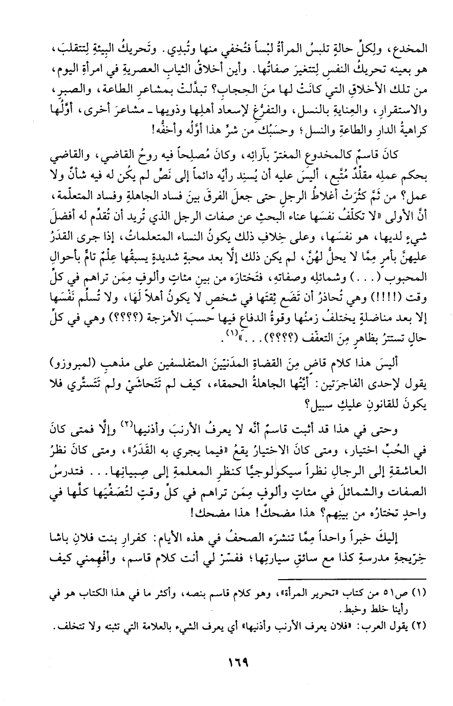 1 ص51 من كتاب "تحرير المرأة"، وهو كلام قاسم بنصه، وأكثر ما في هذا الكتاب هو في رأينا خلط وخبط.