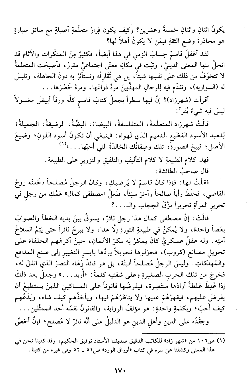 فقلت لها: فإذا كان قاسم لا يرضيكِ، وكان الرجل مصلحًا دخلتْهُ روح القاضي، فخلط رأيًا صالحًا وآخر سيئًا، فلعل "مصطفى كمال" همكِ من رجل في تحرير المرأة تحريرًا مزق الحجاب والـ ... ؟