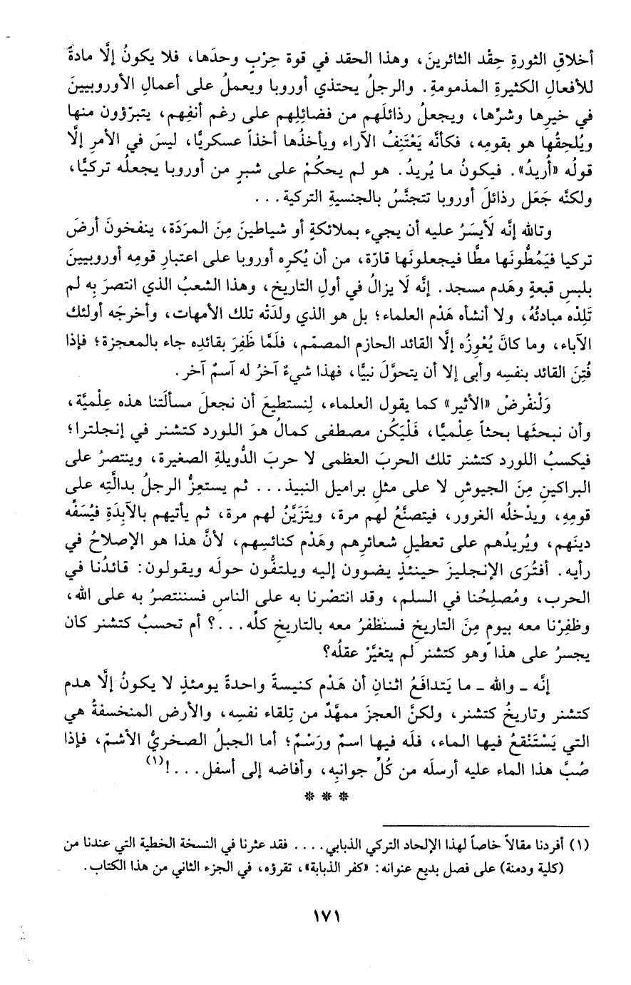 وتالله, إنه لأيسر عليه أن يجيء بملائكة أو شياطين من المَرَدَة، ينفخون أرض تركيا فيَمُطونها مطًّا فيجعلونها قارة، من أن يكره أوروبا على اعتبار قومه أوروبيين بلبس قبعة وهدم مسجد. إنه لا يزال في أول التاريخ, وهذا الشعب الذي انتصر به لم تلده مبادئه، ولا أنشأه هدم العلماء؛ بل هو الذي ولدته تلك الأمهات، وأخرجه أولئك الآباء، وما كان يعوزه إلا القائد الحازم المصمم، فلما ظفر بقائده جاء بالمعجزة؛ فإذا فُتن القائد بنفسه وأبى إلا أن يتحول نبيًّا، فهذا شيء آخر له اسم آخر.