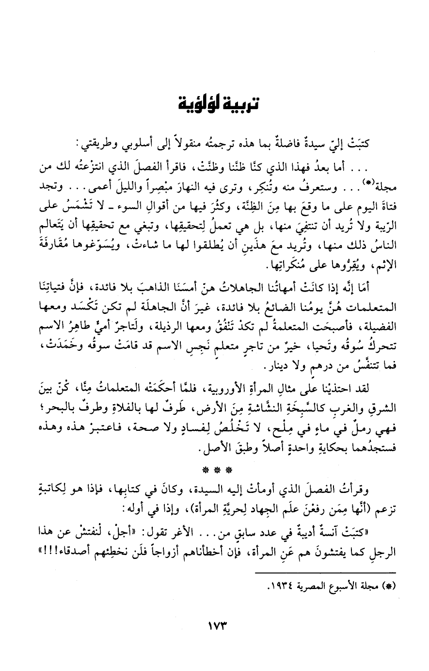 وقرأت الفصل الذي أومأتْ إليه السيدة، وكان في كتابها، فإذا هو لكاتبه تزعم "أنها ممن رفعن علم الجهاد لحرية المرأة"، وإذا في أوله: