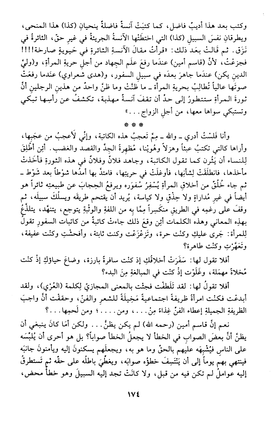 وكتب بعد هذا أديب فاضل، كما كتبتْ آنسة فاضلة ينحيان "كذا" هذا المنحى، ويطرقان نفس السبيل "كذا" التي اختطَتْها الآنسة الجريئة في غير حق، الثائرة في نَزَق. ثم قالت بعد ذلك: "قرأت مقال الآنسة الثائرة في حيوية صارخة!!!! فجزعت؛ لأن "قاسم أمين" عندما رفع علم الجهاد من أجل حرية المرأة، و"ولي الدين يكن" عندما جاهر بعده في سبيل السفور، و"هدى شعراوي" عندما رفعت صوتها عاليًا تطالب بحرية المرأة, ما ظنت وما ظن واحد من هذين الرجلين أن ثورة المرأة ستتطور إلى حد أن تقف آنسة مهذبة، تكشف عن رأسها تبكي وتستبكي سواها معها، من أجل الزواج".