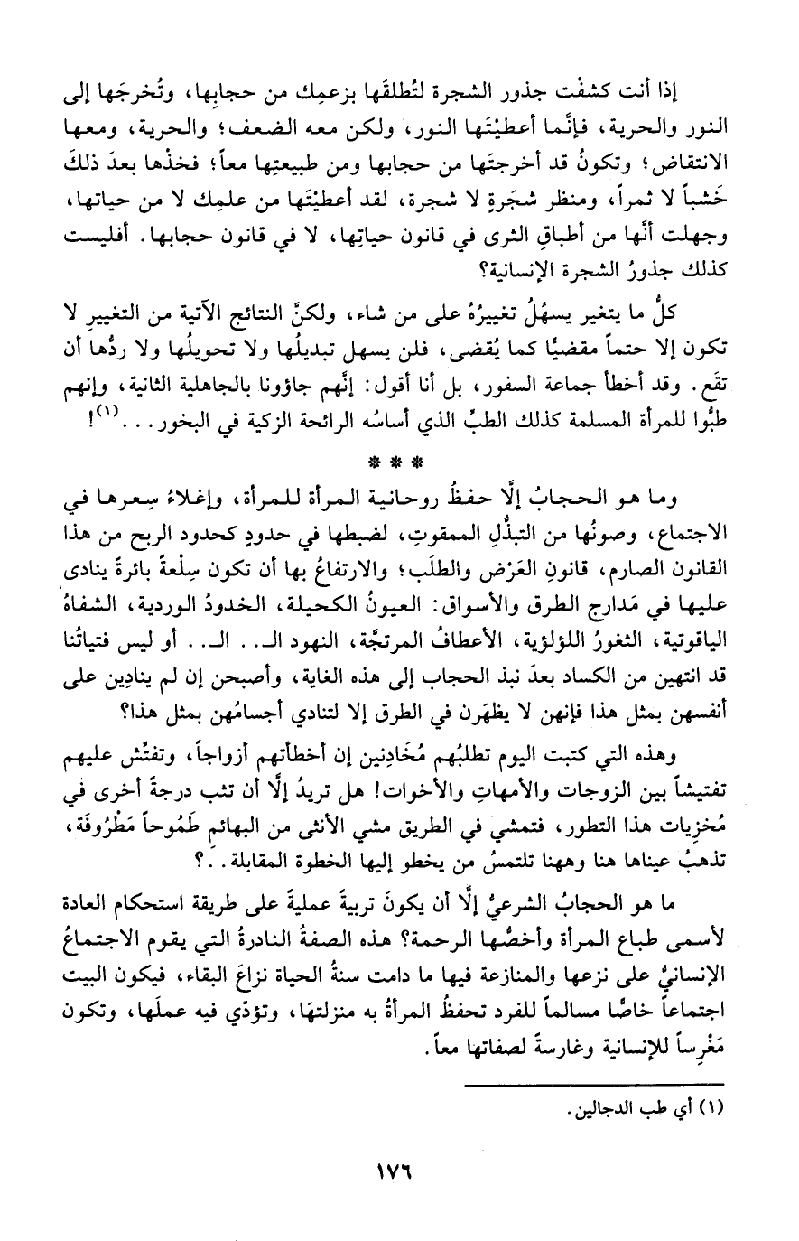 وما هو الحجاب إلا حفظ روحانية المرأة للمرأة، وإغلاء سعرها في الاجتماع, وصونها من التبذل الممقوت؛ لضبطها في حدود كحدود الربح من هذا القانون الصارم، قانون العرض والطلب؛ والارتفاع بها أن تكون سلعة بائرة ينادى عليها في مدارج الطرق والأسواق: العيون الكحيلة، الخدود الوردية، الشفاه الياقوتية، الثغور اللؤلؤية، الأعطاف المرتجة، النهود الـ ... الـ ... أوليس فتياتنا قد انتهين من الكساد بعد نبذ الحجاب إلى هذه الغاية، وأصبحن إن لم ينادين على أنفسهن بمثل هذا فإنهن لا يظهرن في الطرق إلا لتنادي أجسامهن بمثل هذا؟
