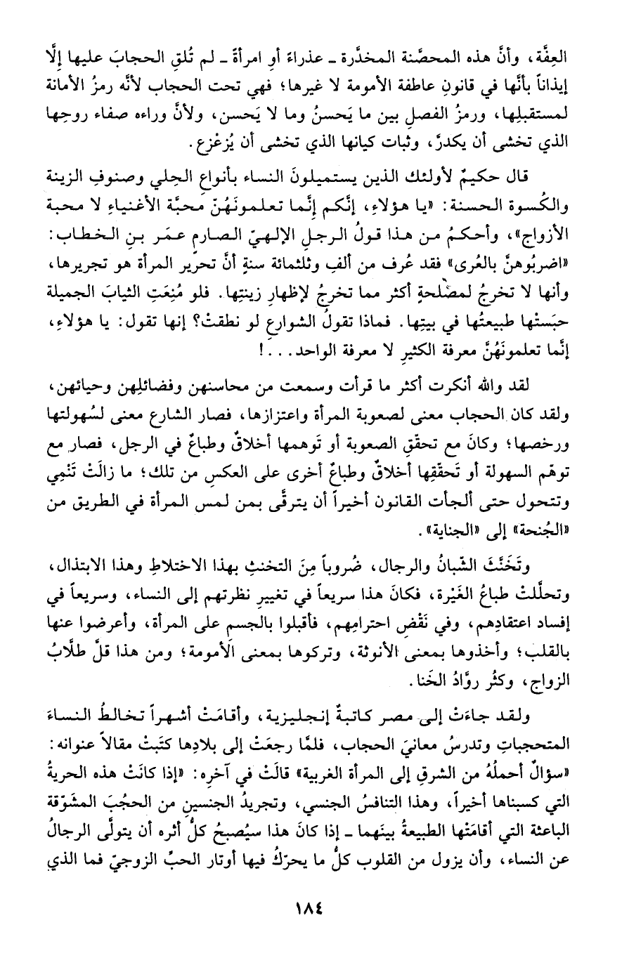 لقد -والله- أنكرت أكثر ما قرأت وسمعت من محاسنهن وفضائلهن وحياتهن، ولقد كان الحجاب معنى لصعوبة المرأة واعتزازها، فصار الشارع معنى لسهولتها ورخصها؛ وكان مع تحقق الصعوبة أو توهمها أخلاق وطباع في الرجل، فصار مع توهم السهولة أو تحققها أخلاق وطباع أخرى على العكس من تلك؛ ما زالت تنمي وتتحول حتى ألجأت القانون أخيرًا أن يترقى بمن لمس المرأة في الطريق من "الجنحة" إلى "الجناية".