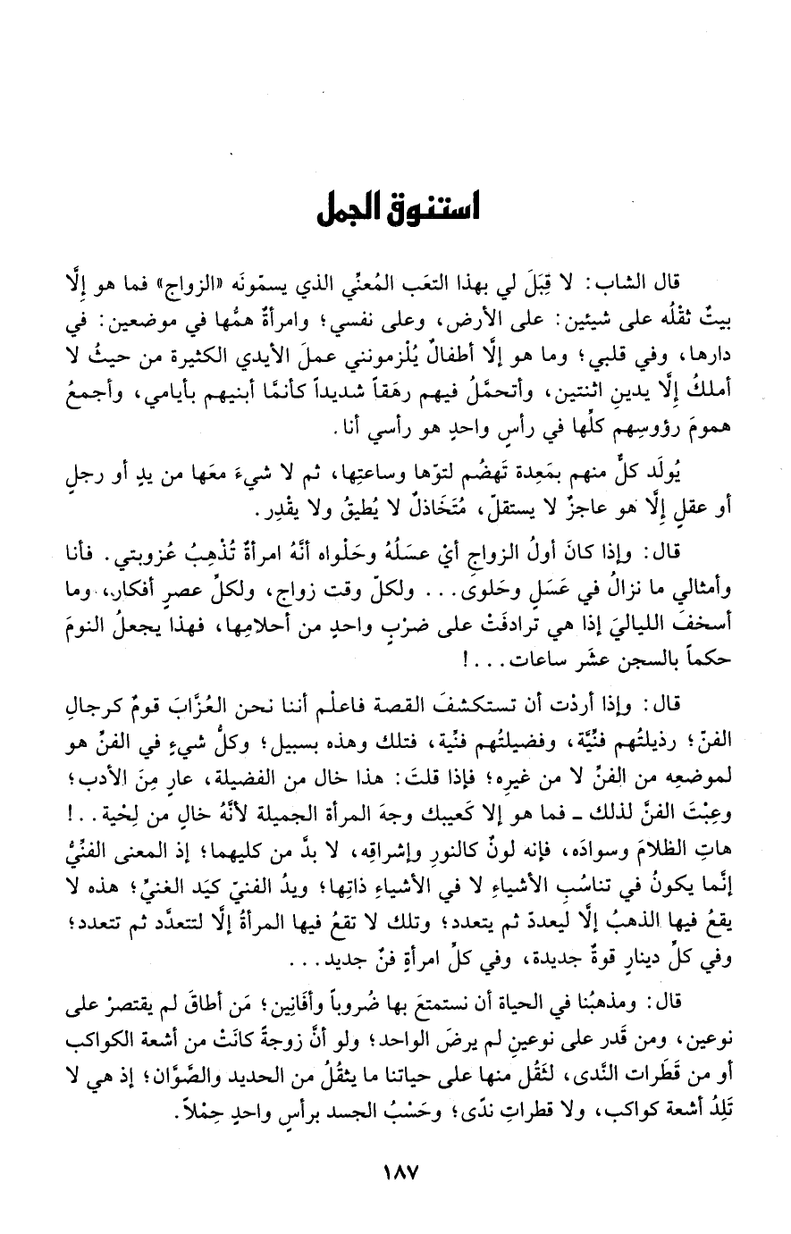 قال: ومذهبنا في الحياة أن نستمتع بها ضروبًا وأفانين؛ من أطاق لم يقتصر على نوعين، ومن قدر على نوعين لم يرض الواحد؛ ولو أن زوجة كانت من أشعة الكواكب أو من قطرات الندى، لثقل منها على حياتنا ما يثقل من الحديد والصَّوَّان؛ إذ هي لا تلد أشعة كواكب، ولا قطرات ندى؛ وحَسْب الجسد برأس واحد حِمْلًا.