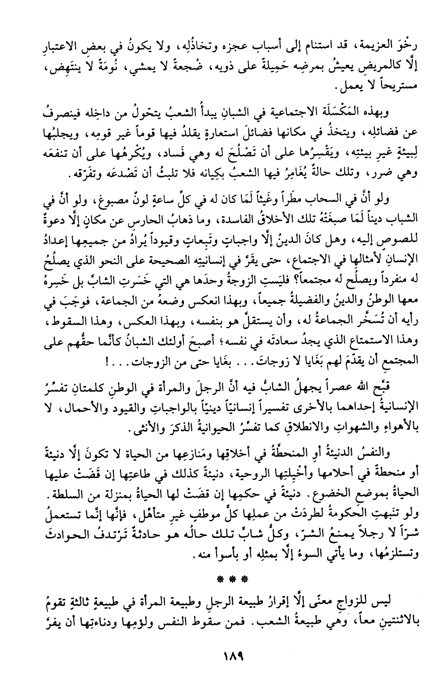ولو أن في السحاب مطرًا وغيثًا لما كان له في كل ساعة لون مصبوغ، ولو أن في الشباب دينًا لما صبغته تلك الأخلاق الفاسدة، وما ذهاب الحارس عن مكان إلا دعوة للصوص إليه، وهل كان الدين إلا واجبات وتبعات وقيودًا يراد من جميعها إعداد الإنسان لأمثالها في الاجتماع، حتى يقر في إنسانيته الصحيحة على النحو الذي يصلح له منفردًا, ويصلح له مجتمعًا؟ فليست الزوجة وحدها هي التي خسرت الشاب بل خسره معها الوطن والدين والفضيلة جميعًا، وبهذا انعكس وضعة من الجماعة، فوجب في رأيه أن تسخر الجماعة له، وأن يستقل هو بنفسه، وبهذا العكس, وهذا السقوط، وهذا الاستمتاع الذي يجد سعادته في نفسه؛ أصبح أولئك الشبان كأنما حقهم على المجتمع أن يقدم لهم بغايا لا زوجات, بغايا حتى من الزوجات!