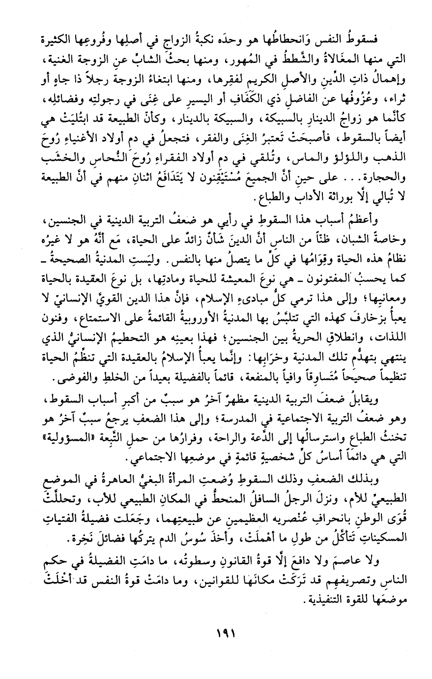 وأعظم أسباب هذا السقوط في رأيي هو ضعف التربية الدينية في الجنسين، وخاصة الشبان، ظنًّا من الناس أن الدين شأن زائد على الحياة، مع أنه هو لا غيره نظام هذه الحياة وقوامها في كل ما يتصل منها بالنفس. وليست المدنية الصحيحة -كما يحسب المفتونون- هي نوع المعيشة للحياة ومادتها، بل نوع العقيدة بالحياة ومعانيها؛ وإلى هذا ترمي كل مبادئ الإسلام، فإن هذا الدين القوي الإنساني لا يعبأ بزخارف كهذه التي تتلبّس بها المدنية الأوروبية القائمة على الاستمتاع، وفنون اللذات، وانطلاق الحرية بين الجنسين؛ فهذا بعينه هو التحطيم الإنساني الذي ينتهي بتهدم تلك المدنية وخرابها. وإنما يعبأ الإسلام بالعقيدة التي تنظّم الحياة تنظيمًا صحيحًا متساوقًا وافيًا بالمنفعة، قائمًا بالفضيلة, بعيدًا من الخلط والفوضى.