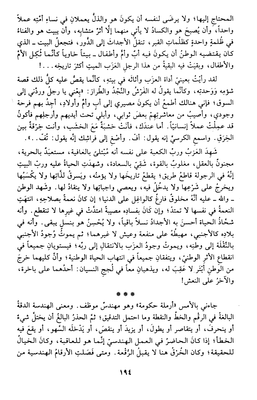 جاءني بالأمس "أرملة حكومة" وهو مهندس موظف. ومعنى الهندسة الدقة البالغة في الرقْم والخط والنقطة وما احتمل التدقيق؛ ثم الحذر البالغ أن يختل شيء أو ينحرف، أو يتقاصر أو يطول، أو يزيد أو ينقص، أو يدخله السهو أو يقع فيه الخطأ؛ إذا كان الحاضر في العمل الهندسي إنما هو للعاقبة، وكان الخيال للحقيقة؛ وكان الخُرْق هنا لا يقبل الرُّقْعة. ومتى فصلت الأرقام الهندسية من