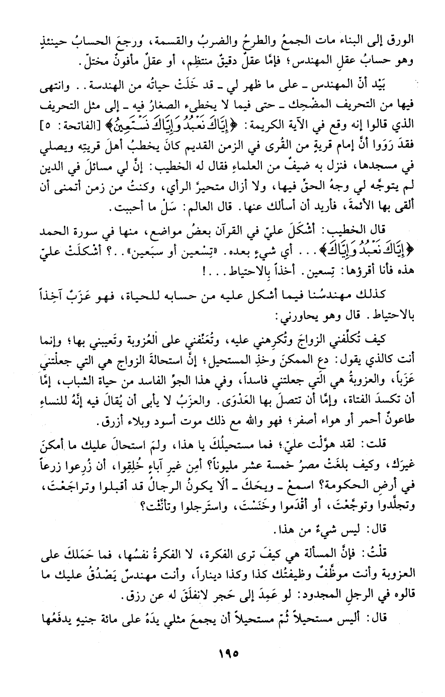 بيد أن المهندس -على ما ظهر لي- قد خلت حياته من الهندسة, وانتهى فيها من التحريف المضحك -حتى فيما لا يخطئ الصغار فيه- إلى مثل التحريف الذي قالوا: إنه وقع في الآية الكريمة: {إِيَّاكَ نَعْبُدُ وَإِيَّاكَ} [الفاتحة: 5] فقد رووا أن إمام قرية من القرى في الزمن القديم كان يخطب أهل قريته ويصلي في مسجدها، فنزل به ضيف من العلماء فقال له الخطيب: إن لي مسائل في الدين لم يتوجه لي وجه الحق فيها، ولا أزال متحير الرأي، وكنتُ من زمن أتمنى أن ألقى بها الأئمة، فأريد أن أسألك عنها. قال العالم: سل ما أحببت.