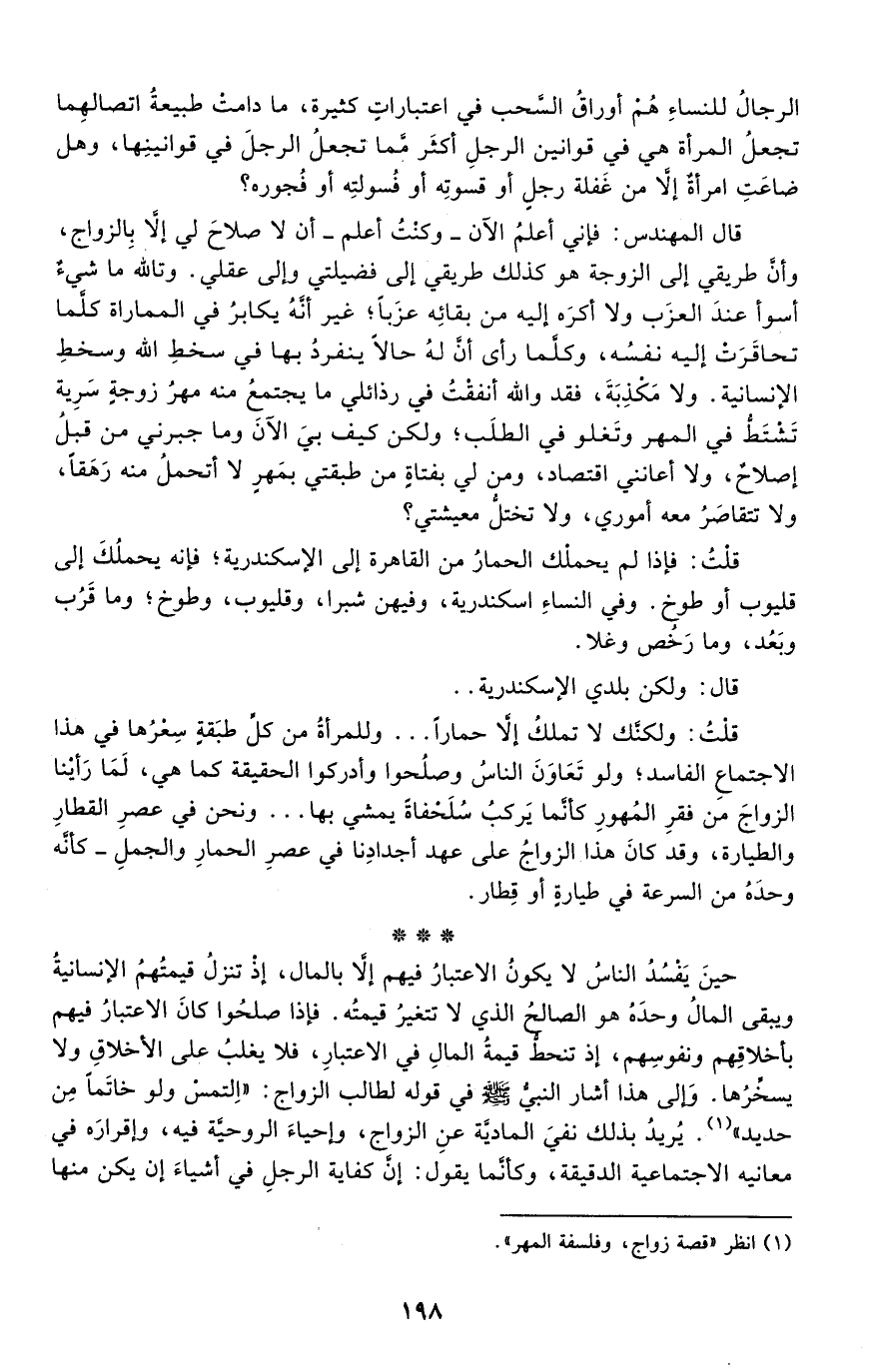 قلت: ولكنك لا تملك إلا حمارًا ... وللمرأة من كل طبقة سعرها في هذا الاجتماع الفاسد؛ ولو تعاون الناس وصلُحوا وأدركوا الحقيقة كما هي، لما رأينا الزواج من فقر المهور كأنما يركب سلحفاه يمشي بها, ونحن في عصر القطار والطيارة، وقد كان هذا الزواج على عهد أجدادنا في عصر الحمار والجمل, كأنه وحده من السرعة في طيارة أو قطار.